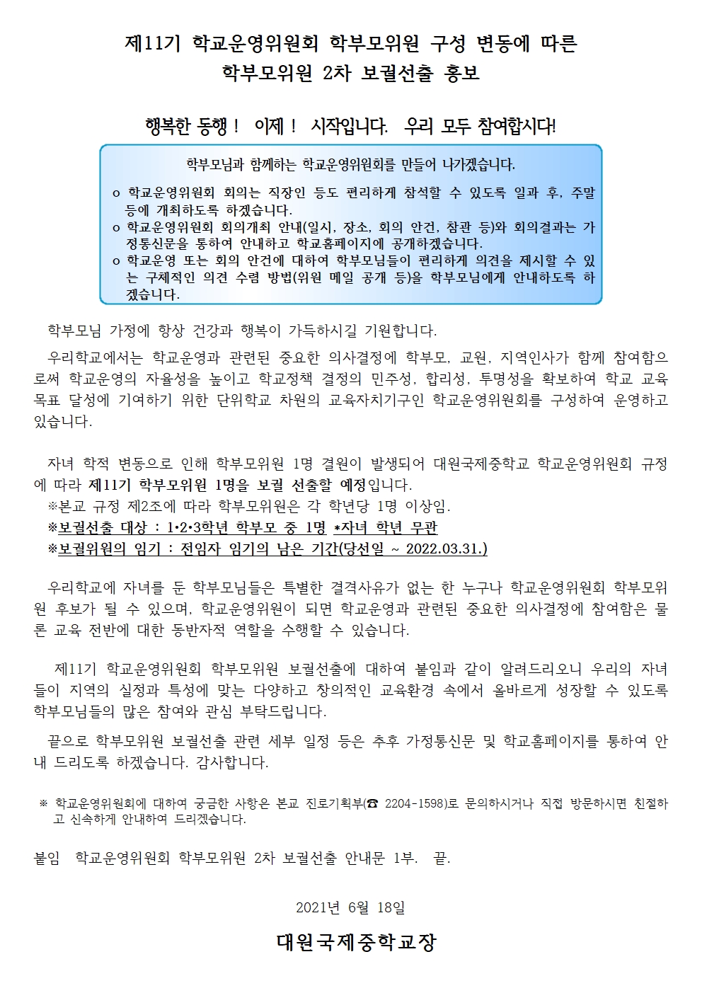 Á¦11±â Çб³¿î¿µÀ§¿øÈ¸ À§¿ø ±¸¼º º¯µ¿ ¹× ÇкθðÀ§¿ø 2Â÷ º¸±È¼±Ãâ È«º¸(Çб³È¨ÆäÀÌÁö) 1ºÎ.pdf Á¦11±â Çб³¿î¿µÀ§¿øÈ¸ À§¿ø ±¸¼º º¯µ¿ ¹× ÇкθðÀ§¿ø 2Â÷ º¸±È¼±Ãâ È«º¸(Çб³È¨ÆäÀÌÁö) 1ºÎ.pdf   ´Ù¿î·Îµå ¼ö : [ 48 ]