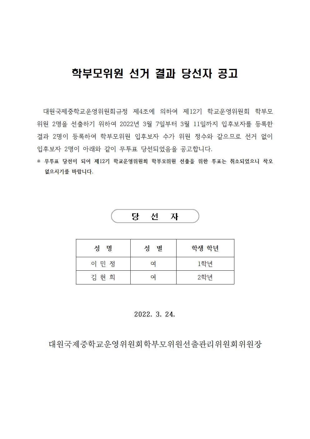 2022Çг⵵ Á¦12±â ÇкθðÀ§¿ø ¼±°Å °á°ú ´ç¼±ÀÚ °ø°í