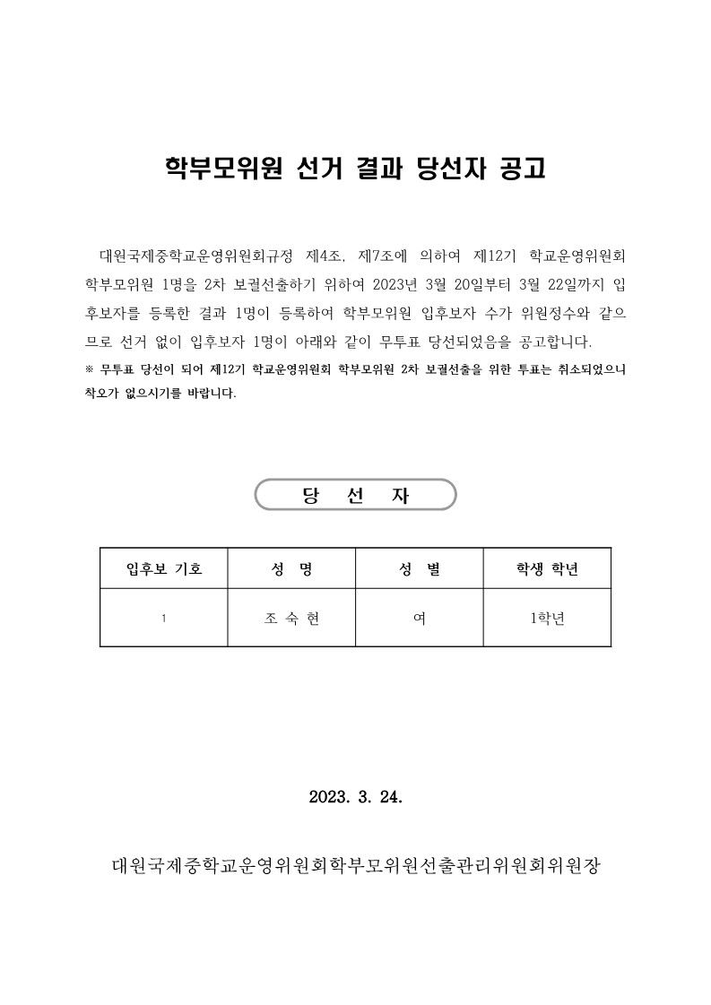 2023Çг⵵ Á¦12±â Çб³¿î¿µÀ§¿øÈ¸ ÇкθðÀ§¿ø 2Â÷ º¸±È¼±Ãâ °á°ú ´ç¼±ÀÚ °ø°í(¹«ÅõÇ¥)