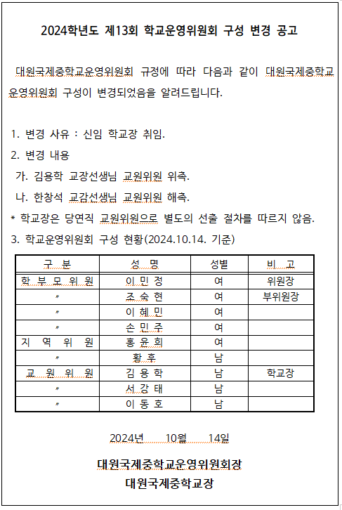 Á¦13ȸ Çб³¿î¿µÀ§¿øÈ¸ ±¸¼º º¯°æ °ø°í