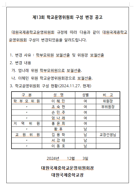 Çб³¿î¿µÀ§¿øÈ¸ ±¸¼º º¯°æ °ø°í