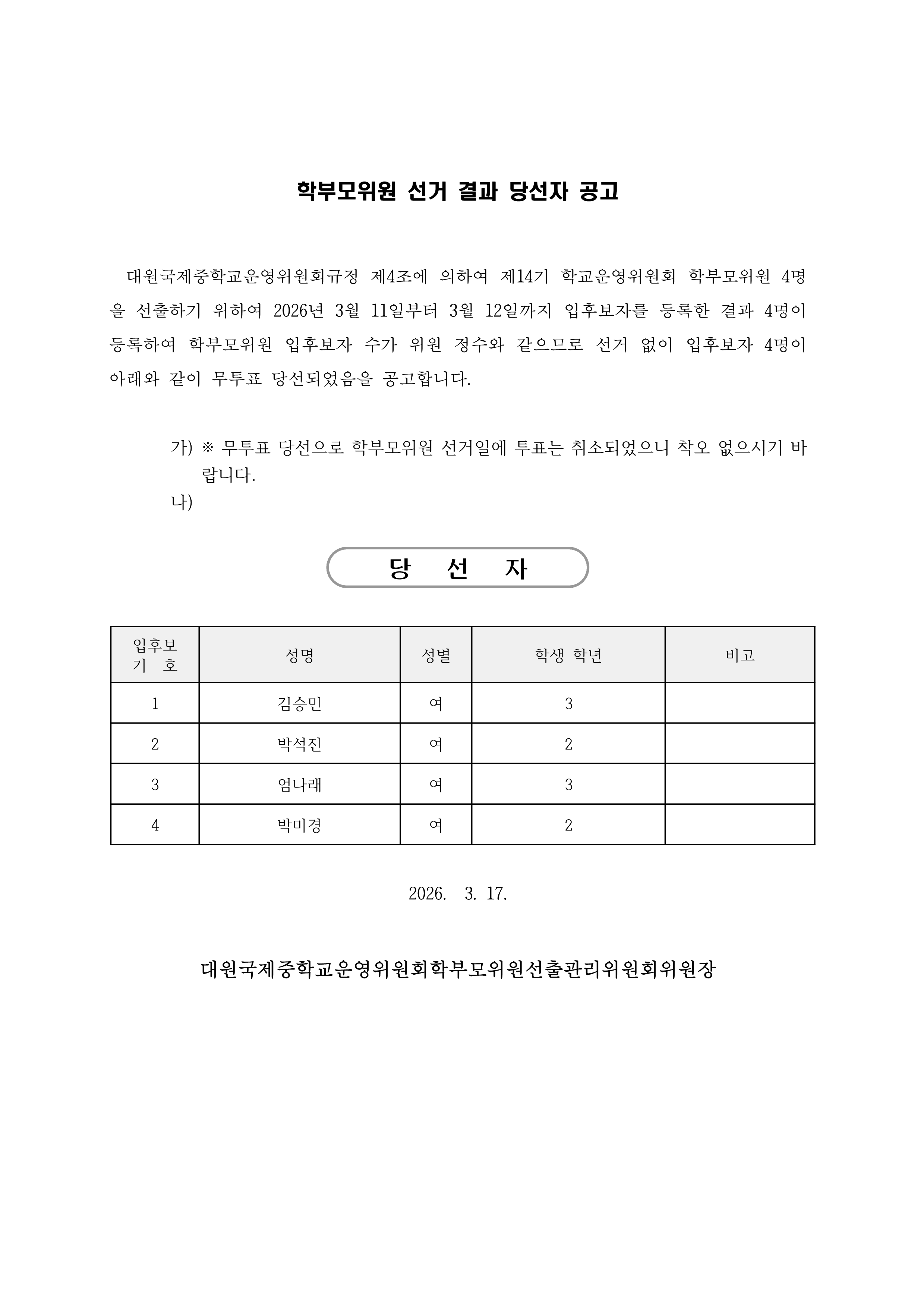 Çб³¿î¿µÀ§¿øÈ¸ ÇкθðÀ§¿ø ´ç¼±ÀÚ È®Á¤ ¹× °ø°í(ÅëÁö)