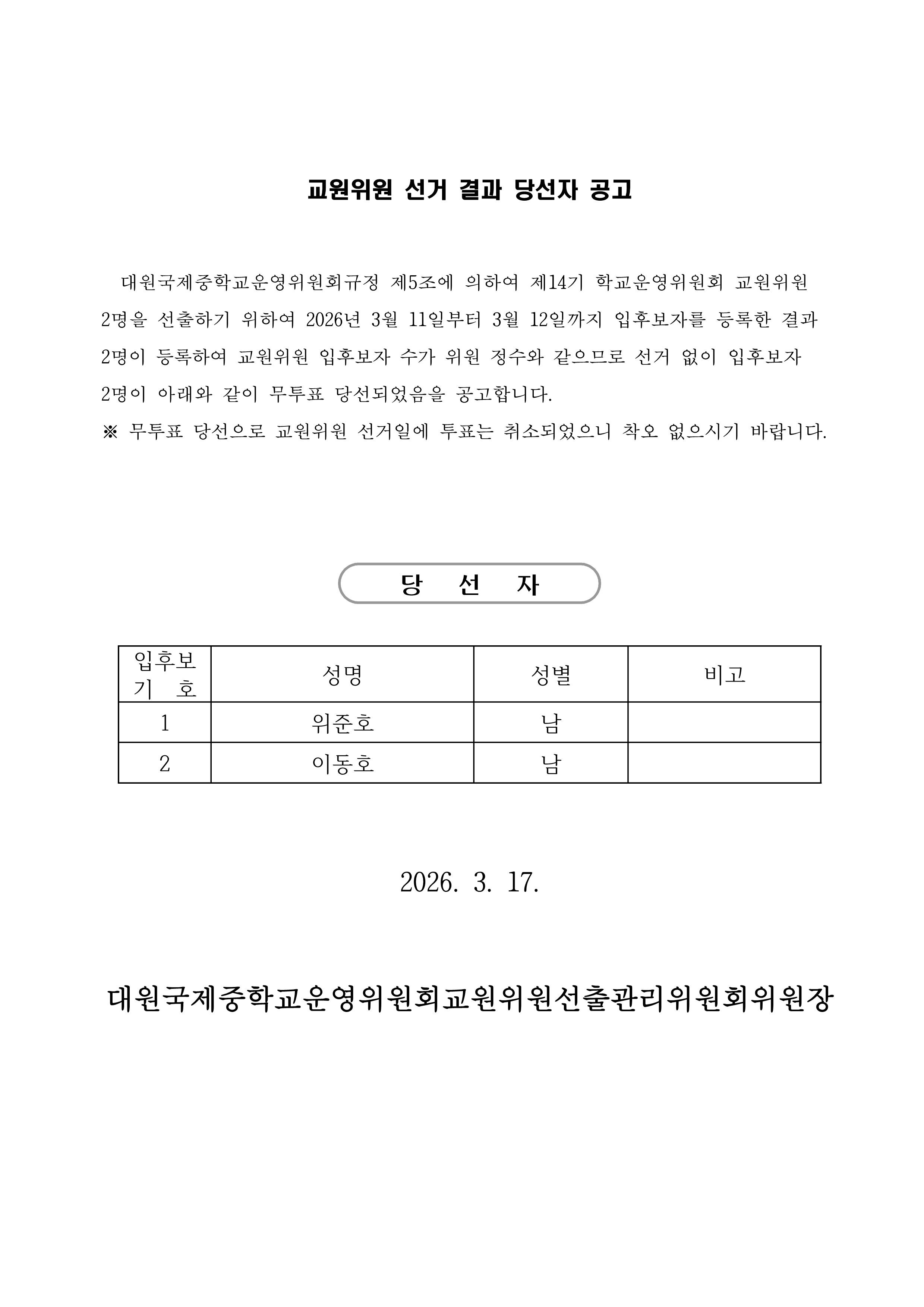 Çб³¿î¿µÀ§¿øÈ¸ ÇкθðÀ§¿ø ´ç¼±ÀÚ È®Á¤ ¹× °ø°í(ÅëÁö)