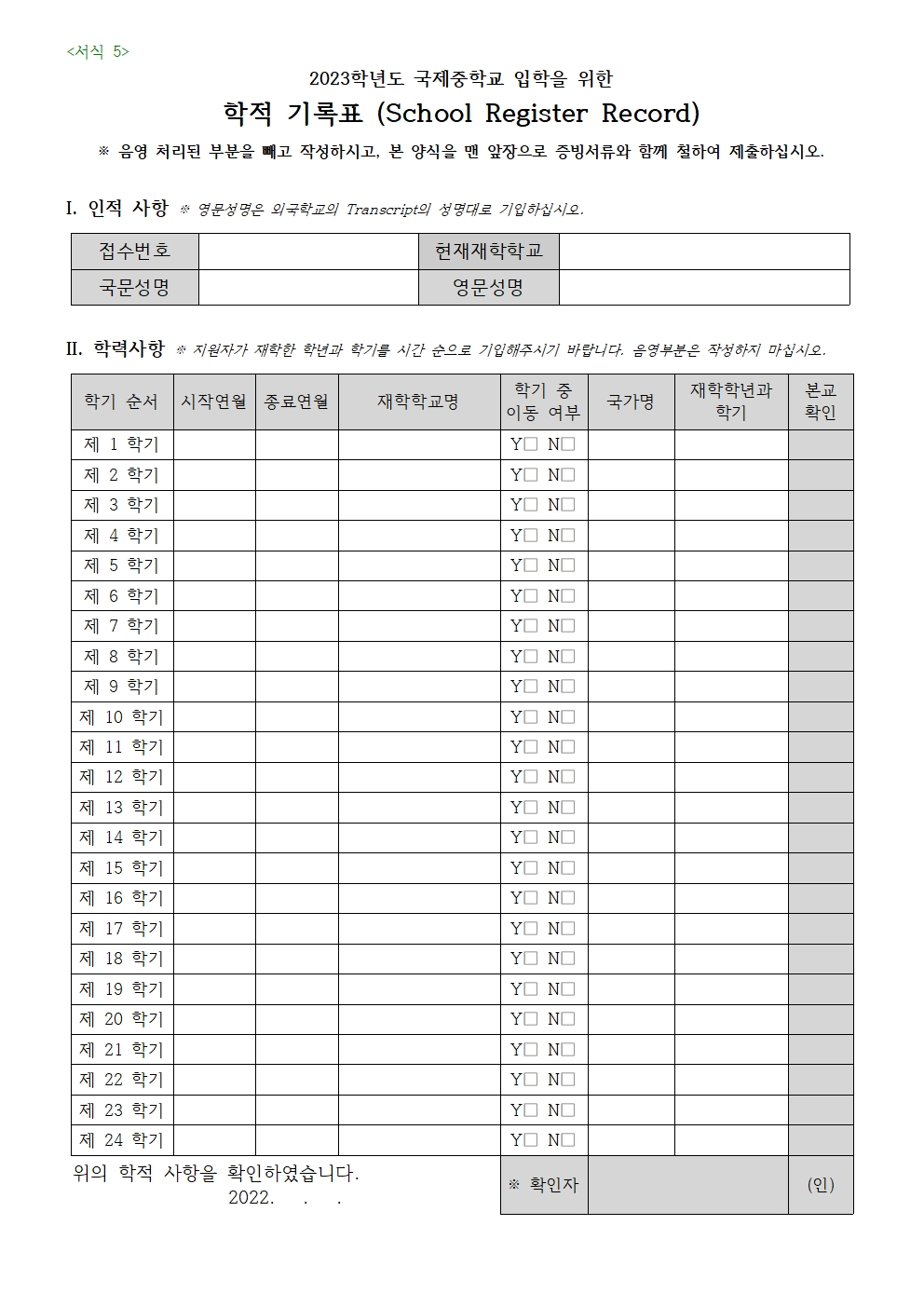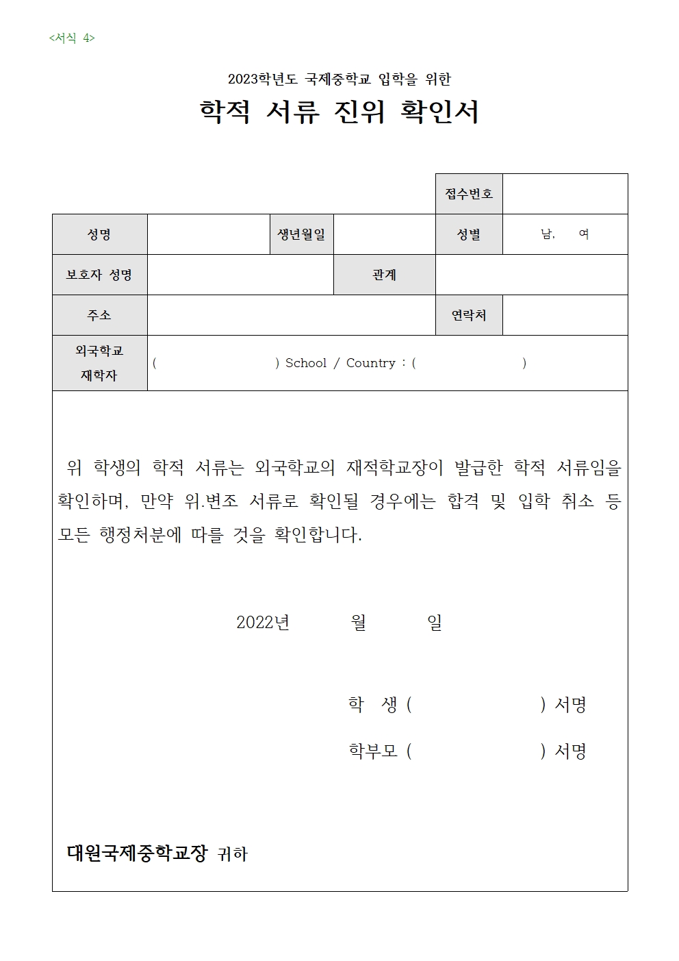 ¾Æ·¡ ¼­½ÄÀº ¿Ü±¹Çб³ ÀçÇÐÀÚ/±¹³» ¼ÒÀç ÇзÂÀÎÁ¤ ¿Ü±¹ÀÎ Çб³ ÀçÇÐÀÚ ¸¸ ±¹Á¦ÁßÇб³¿¡ Á¦ÃâÇÏ´Â ¾ç½ÄÀÔ´Ï´Ù.