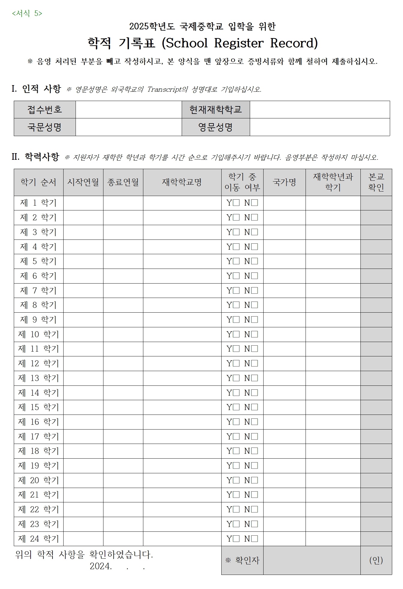 ¾Æ·¡ ¼½ÄÀº ¿Ü±¹Çб³ ÀçÇÐÀÚ/±¹³» ¼ÒÀç ÇзÂÀÎÁ¤ ¿Ü±¹ÀÎ Çб³ ÀçÇÐÀÚ ¸¸ ±¹Á¦ÁßÇб³¿¡ Á¦ÃâÇÏ´Â ¾ç½ÄÀÔ´Ï´Ù. (°ú°Å ¿Ü±¹Çб³¿¡ ÀçÇÐÇÏ¿´À¸³ª ¿ø¼ Á¢¼öÀÏ ÇöÀç ¼¿ï ¼ÒÀç ÃʵîÇб³¿¡ ÀçÇÐ ÁßÀÎ °æ¿ì´Â ÇØ´ç »çÇ× ¾øÀ½)