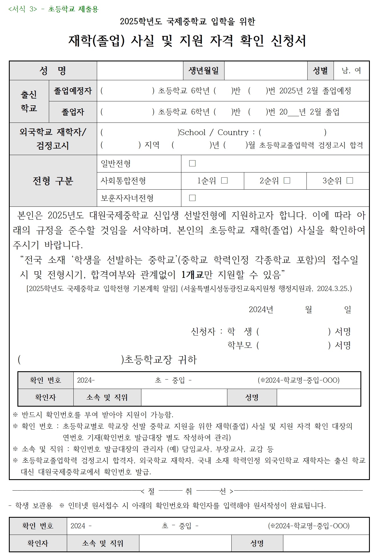 [¼­½Ä 3] ÀçÇлç½Ç ¹× Áö¿ø ÀÚ°Ý È®ÀÎ ½Åû¼­(ÃʵîÇб³ Á¦Ãâ¿ë)