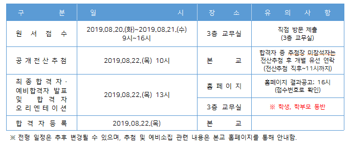 2019Çг⵵ ÀçÇлýÀÇ °á¿øÀ» Ãæ¿øÇϰíÀÚ ¾Æ·¡¿Í °°ÀÌ ÀüÀÔÇÐ ¹× ÀçÃëÇÐ ÀüÇüÀ» °ø°íÇÕ´Ï´Ù. º» °ø°í¹®Àº “¡¸ÇлýÀ» ¼±¹ßÇÏ´Â ÁßÇб³¡¹ ÀÔÇÐÀüÇü, Àü·ÆíÀÔÇÐ(ÀçÃëÇÐ) ½ÃÇà °ü¸® Áöħ”, “´ë¿ø±¹Á¦ÁßÇб³ ÀüÀÔÇÐ ¹× ÀçÃëÇÐ ÀüÇü ±ÔÁ¤”, “2019Çг⵵ ´ë¿ø±¹Á¦ÁßÇб³ ½ÅÀÔ»ý ÀÔÇÐ ÀüÇü ¿ä°­”, “2019Çг⵵ ¼­¿ïƯº°½Ã¼ºµ¿±¤Áø±³À°Áö¿øÃ» ÁßÇб³ ÀüÀÔÇÐ ¹× ÀçÃëÇÐ ¾÷¹« ½ÃÇà°èȹ”, “2019Çг⵵ ±Í±¹ÀÚ ÆíÀÔÇÐ ½ÃÇà°èȹ”, “2019Çг⵵ ±¹Á¦ÁßÇб³ ¡¸»çȸÅëÇÕÀüÇü¡¹ ÃßÁø °èȹ”¿¡ µû¸£¸ç, ÃÊ·ÁߵÀ°¹ý½ÃÇà·É Á¦66Á¶¿¡ ±Ù°ÅÇÕ´Ï´Ù.