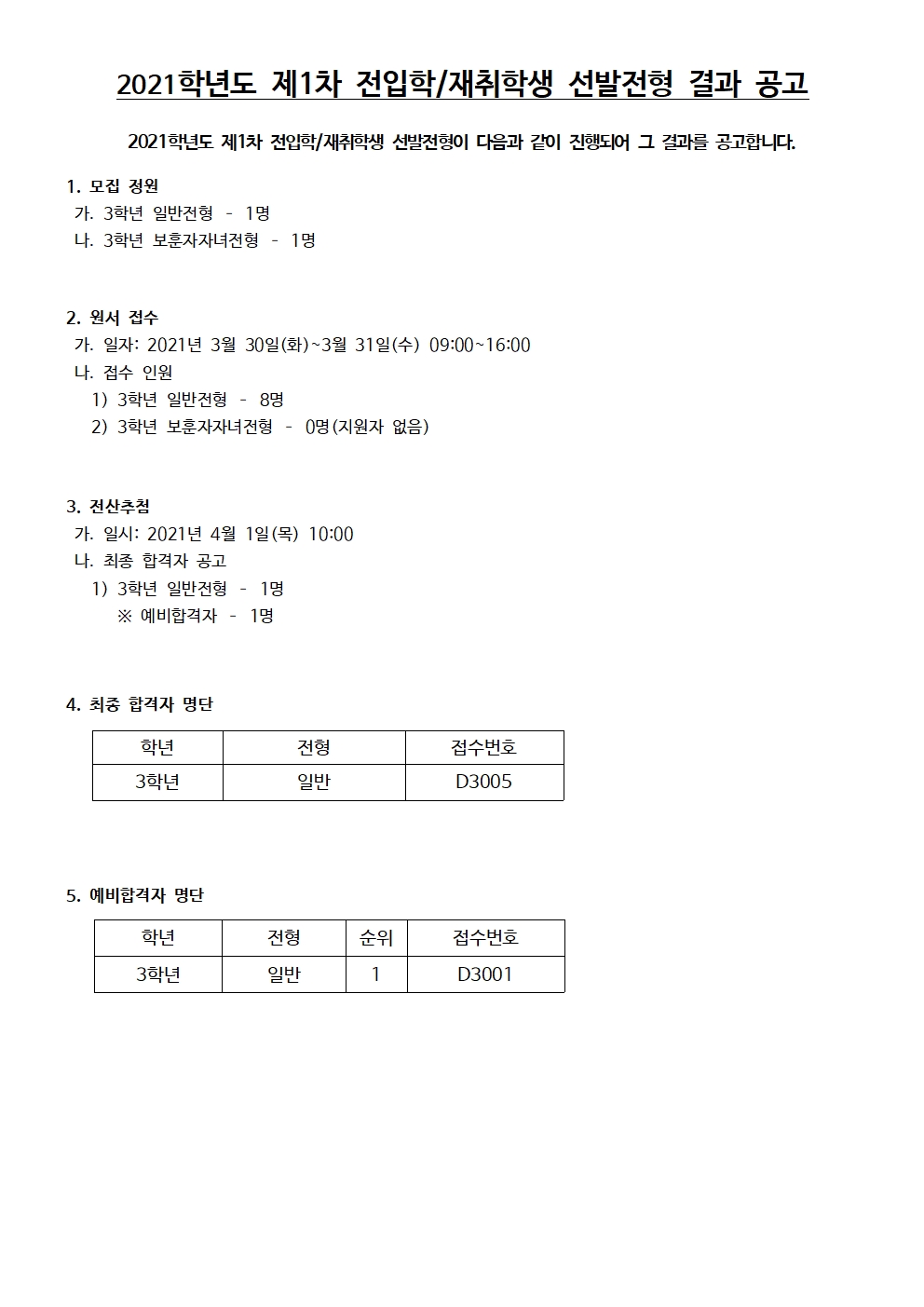 2021Çг⵵ Á¦1Â÷ ÀüÀÔÇÐ/ÀçÃëÇлý ¼±¹ßÀüÇü °á°ú °ø°í