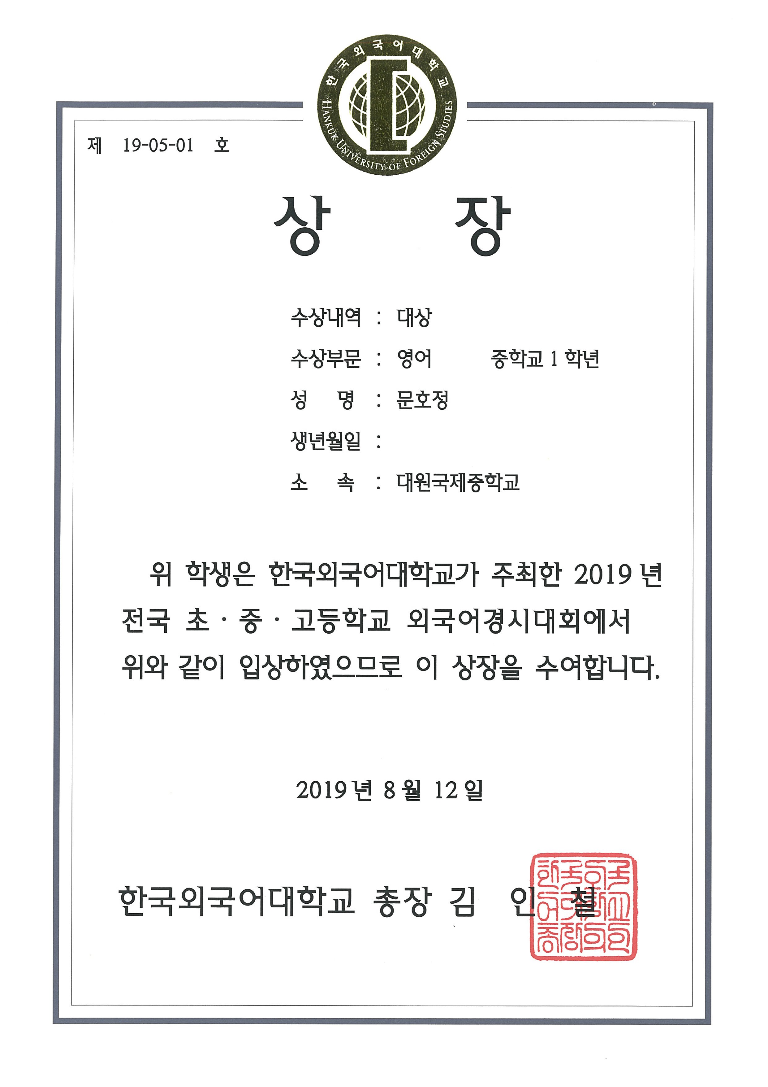 2019³â Àü±¹ ÃÊÁß°íµîÇб³ ¿Ü±¹¾î°æ½Ã´ëȸ ´ë»ó(Çѱ¹¿Ü±¹¾î´ëÇб³ ÁÖÃÖ))