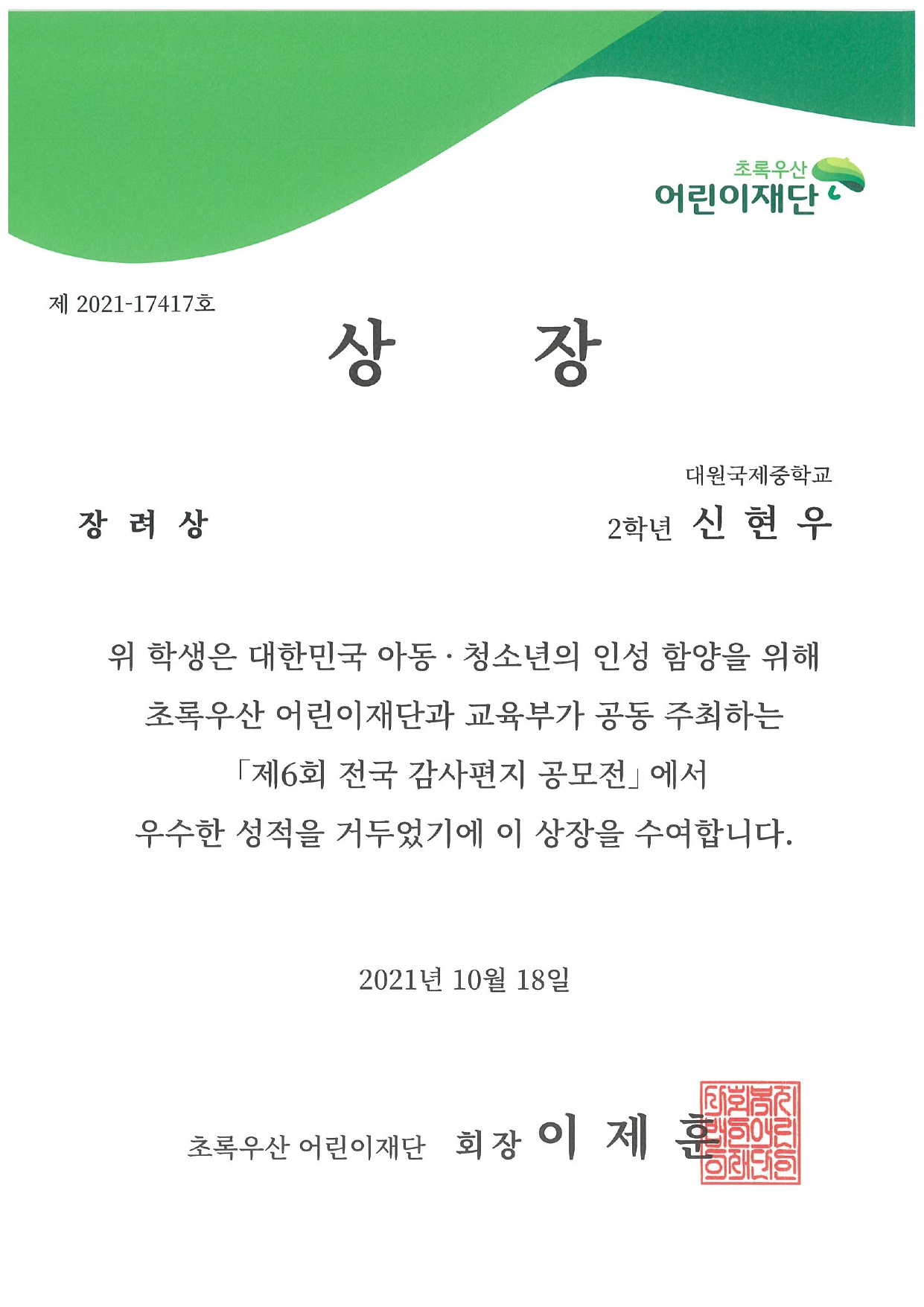 ÃÊ·Ï¿ì»ê ¾î¸°ÀÌÀç´Ü°ú ±³À°ºÎ°¡ °øµ¿ ÁÖÃÖÇÏ´Â ¡¸Á¦6ȸ Àü±¹ °¨»çÆíÁö °ø¸ðÀü¡¹¿¡¼­ 2Çгâ ÇлýµéÀÌ »óÀåÀ» ¼ö¿©ÇÏ¿´½À´Ï´Ù.
