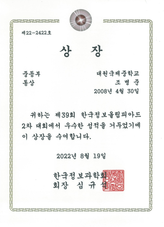 2Çгâ Africa¹Ý Á¶º´ÁØ ÇлýÀÌ Á¦ 39ȸ Çѱ¹Á¤º¸¿Ã¸²ÇǾƵå 2Â÷ ´ëȸ µ¿»óÀ» ¼ö»óÇß½À´Ï´Ù.