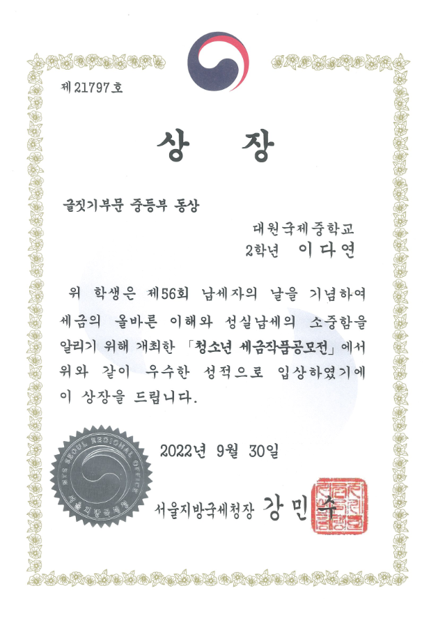 2Çгâ America¹Ý ÀÌ´Ù¿¬ ÇлýÀÌ Á¦56ȸ ³³¼¼ÀÚÀÇ ³¯ ±â³äÇà»çÀΠû¼Ò³â ¼¼±ÝÀÛǰ°ø¸ðÀü¿¡¼­ ±ÛÁþ±âºÎ¹® µ¿»óÀ» ¼ö»óÇß½À´Ï´Ù.