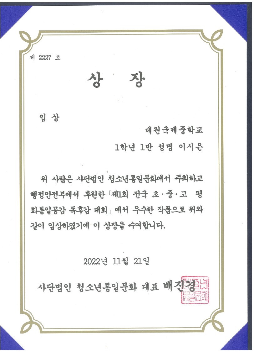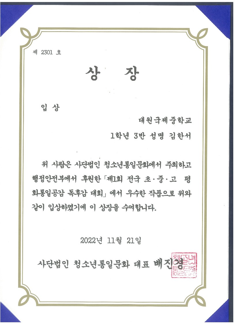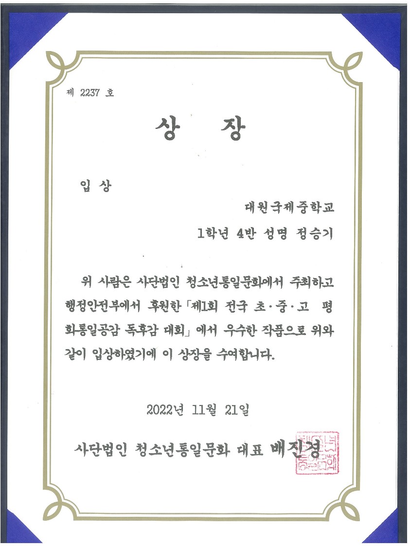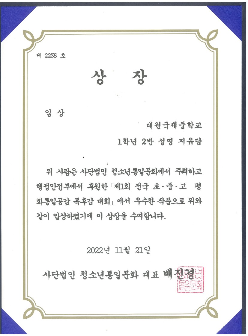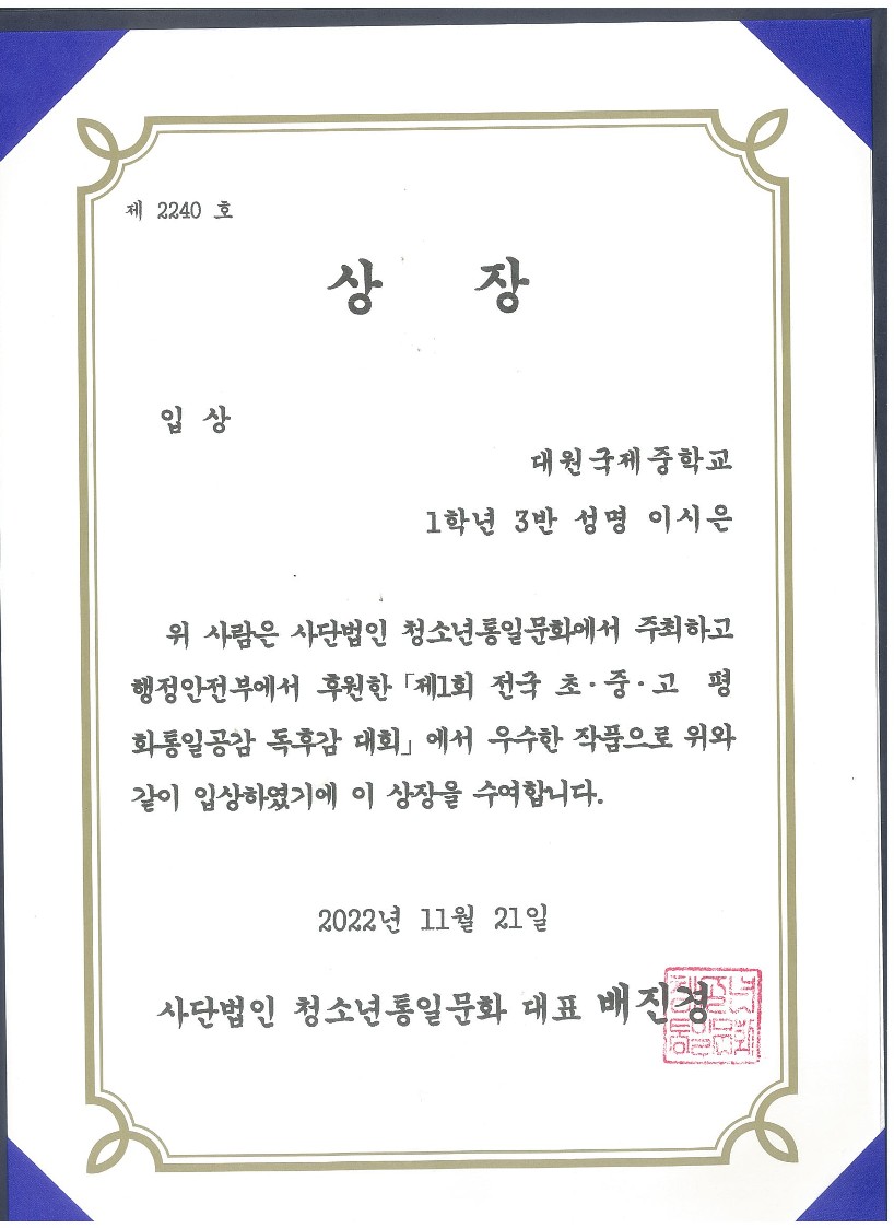 'Á¦1ȸ Àü±¹ ÃÊ.Áß.°í ÆòÈ­ÅëÀϰø°¨ µ¶Èݨ ´ëȸ'¿¡¼­ 1Çгâ Çлý 17¸íÀÌ ÀÔ»ó ¹× ¿ì¼ö»óÀ» ¼ö»óÇÏ¿´½À´Ï´Ù.