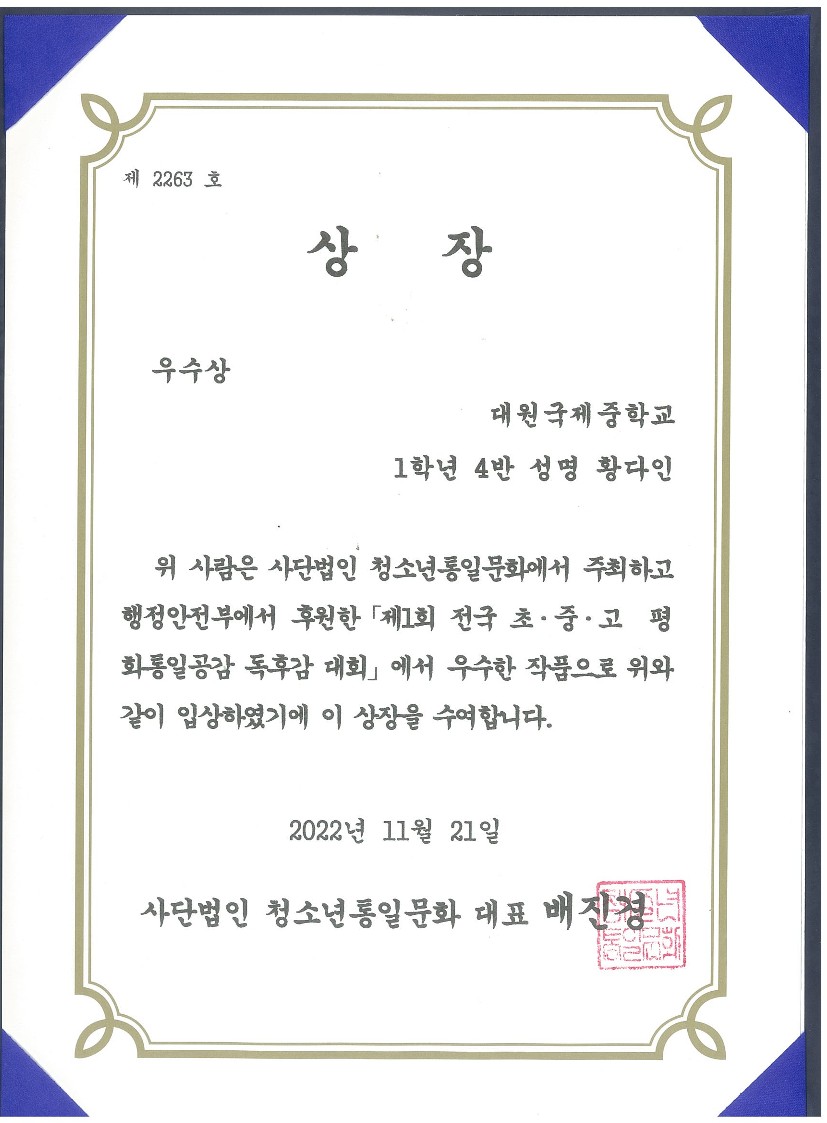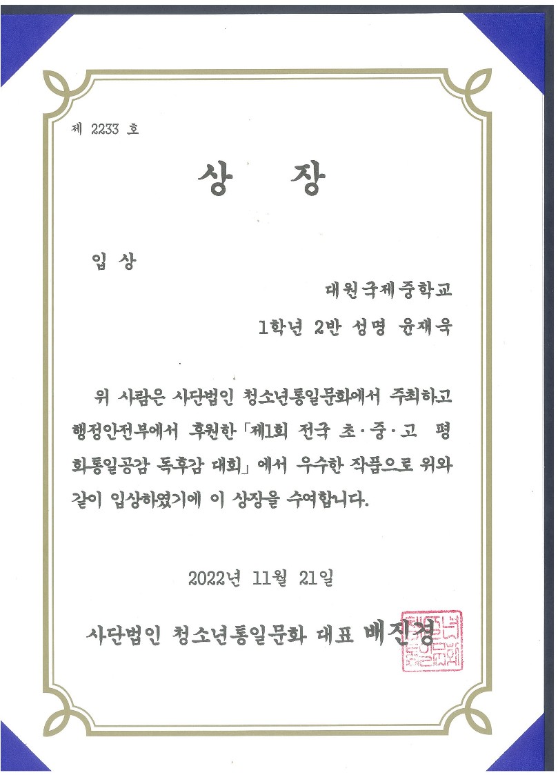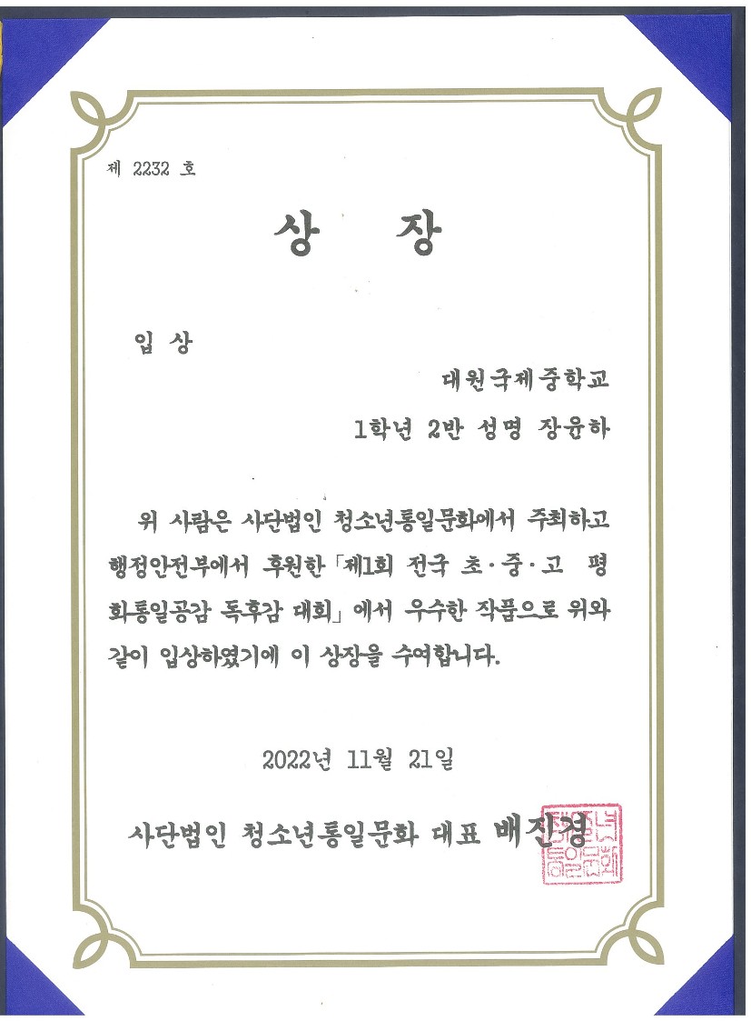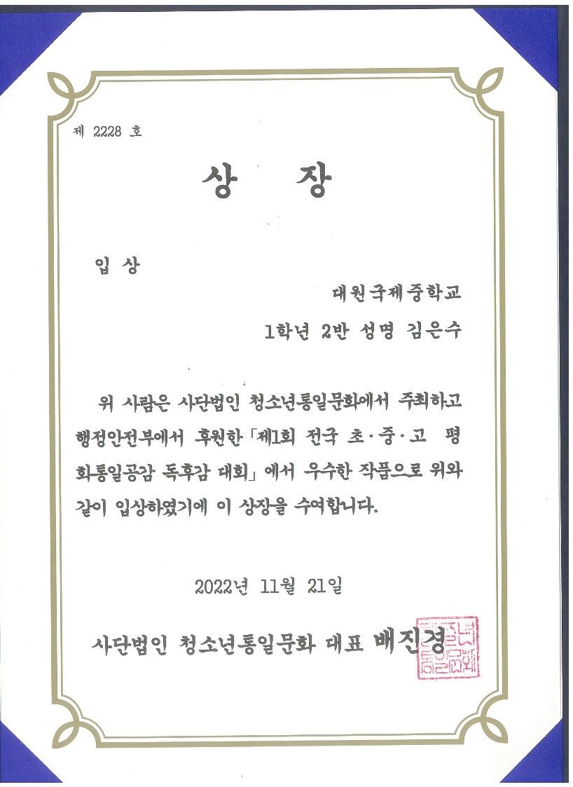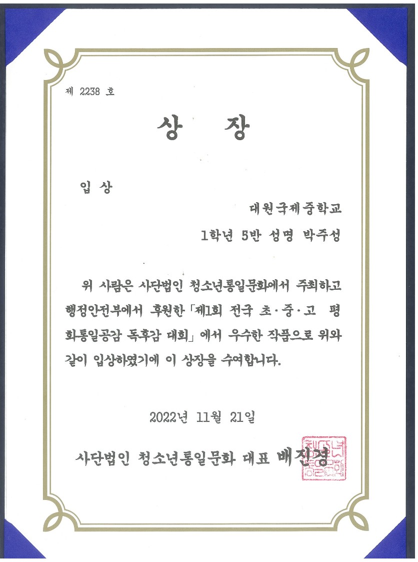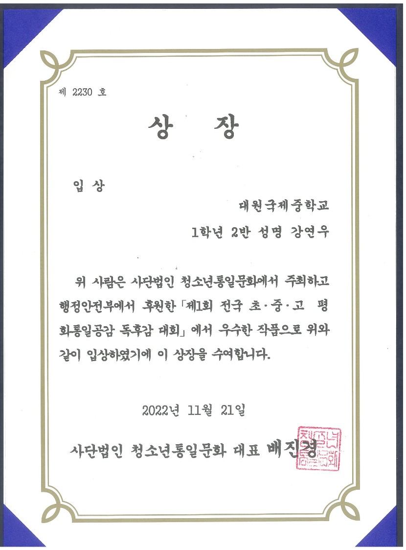 'Á¦1ȸ Àü±¹ ÃÊ.Áß.°í ÆòÈ­ÅëÀϰø°¨ µ¶Èݨ ´ëȸ'¿¡¼­ 1Çгâ Çлý 17¸íÀÌ ÀÔ»ó ¹× ¿ì¼ö»óÀ» ¼ö»óÇÏ¿´½À´Ï´Ù.