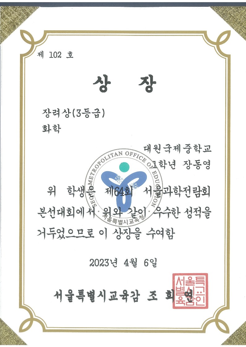 1Çгâ À嵿¿µÇлýÀÌ Á¦64ȸ ¼­¿ï°úÇÐÀü¶÷ȸ º»¼±´ëȸ È­ÇкκРÀå·Á»ó ¼ö»óÇÏ¿´½À´Ï´Ù.