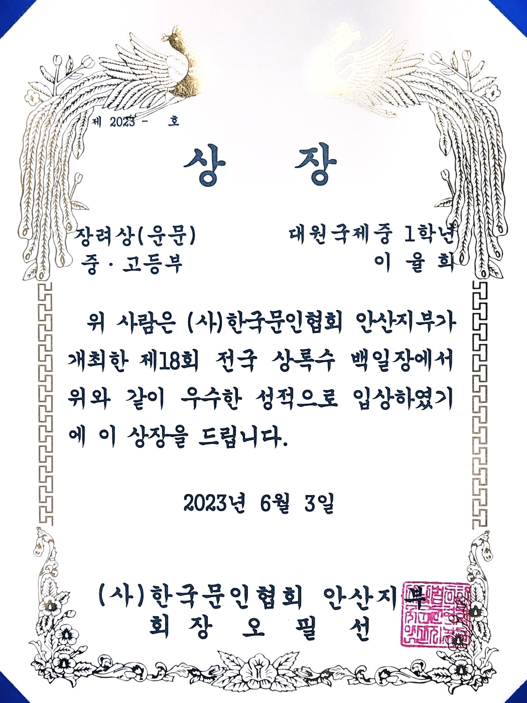 1Çгâ 2¹Ý ÀÌÀ²Èñ ÇлýÀÌ Á¦18ȸ Àü±¹ »ó·Ï¼ö ¹éÀÏÀå ¿î¹® ºÎ¹® Àå·Á»ó ¼ö»óÇÏ¿´½À´Ï´Ù. ÃàÇÏÇÕ´Ï´Ù.