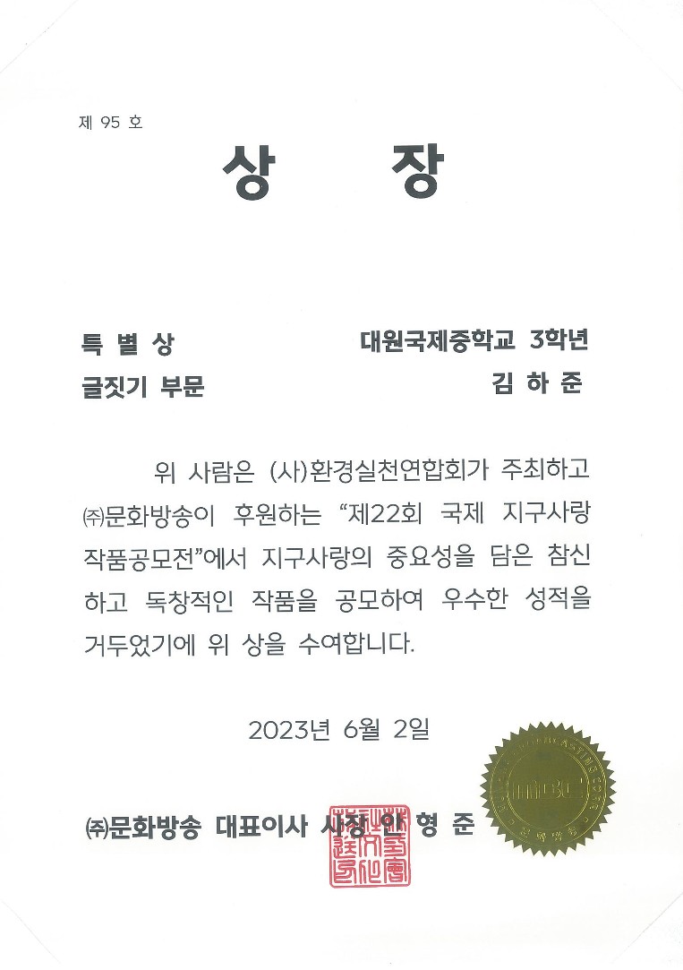 Á¦22ȸ ±¹Á¦ Áö±¸»ç¶û ÀÛǰ °ø¸ðÀü ±ÛÁþ±â ºÎ¹® Ưº°»ó ¼ö»ó