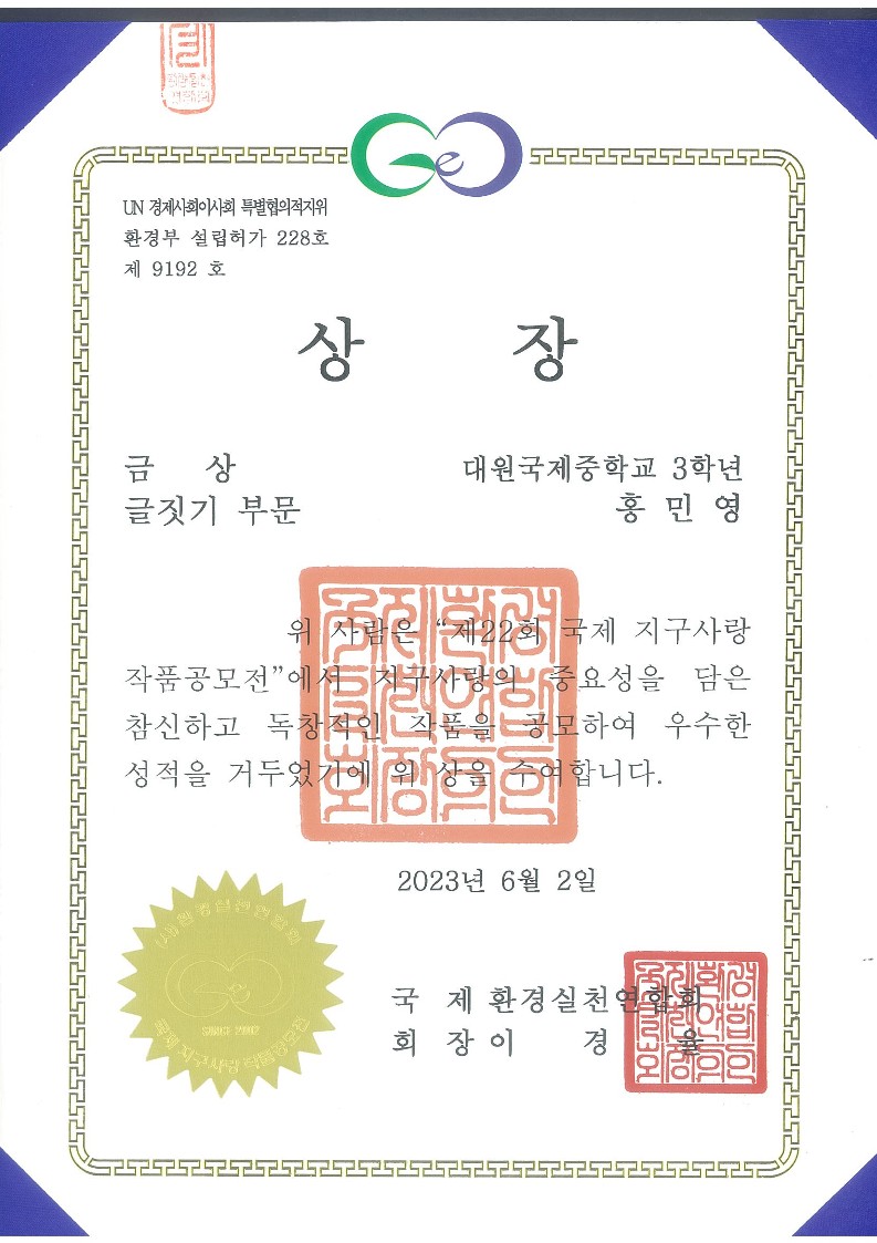 Á¦22ȸ ±¹Á¦ Áö±¸»ç¶û ÀÛǰ°ø¸ðÀü ±ÛÁþ±â ºÎ¹® ±Ý»ó ¼ö»ó