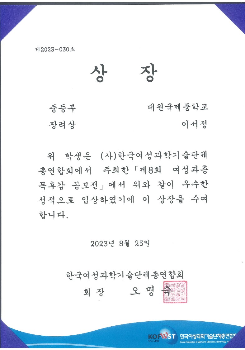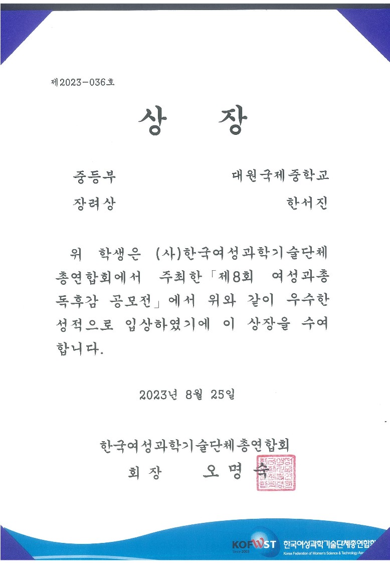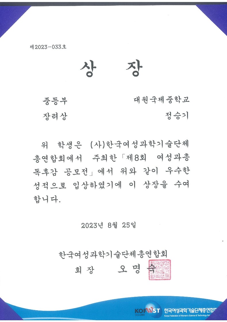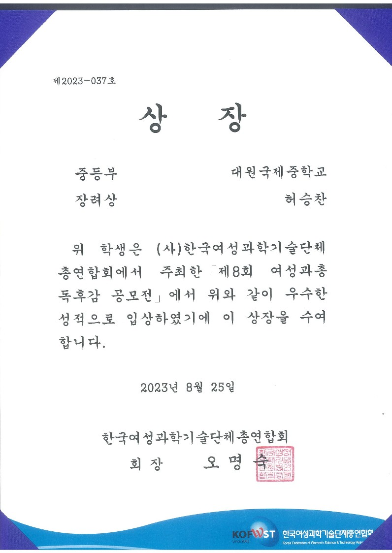 Á¦8ȸ ¿©¼º°úÃÑ µ¶Èݨ °ø¸ðÀü ÃÖ¿ì¼ö»ó ¿ì¼ö»ó