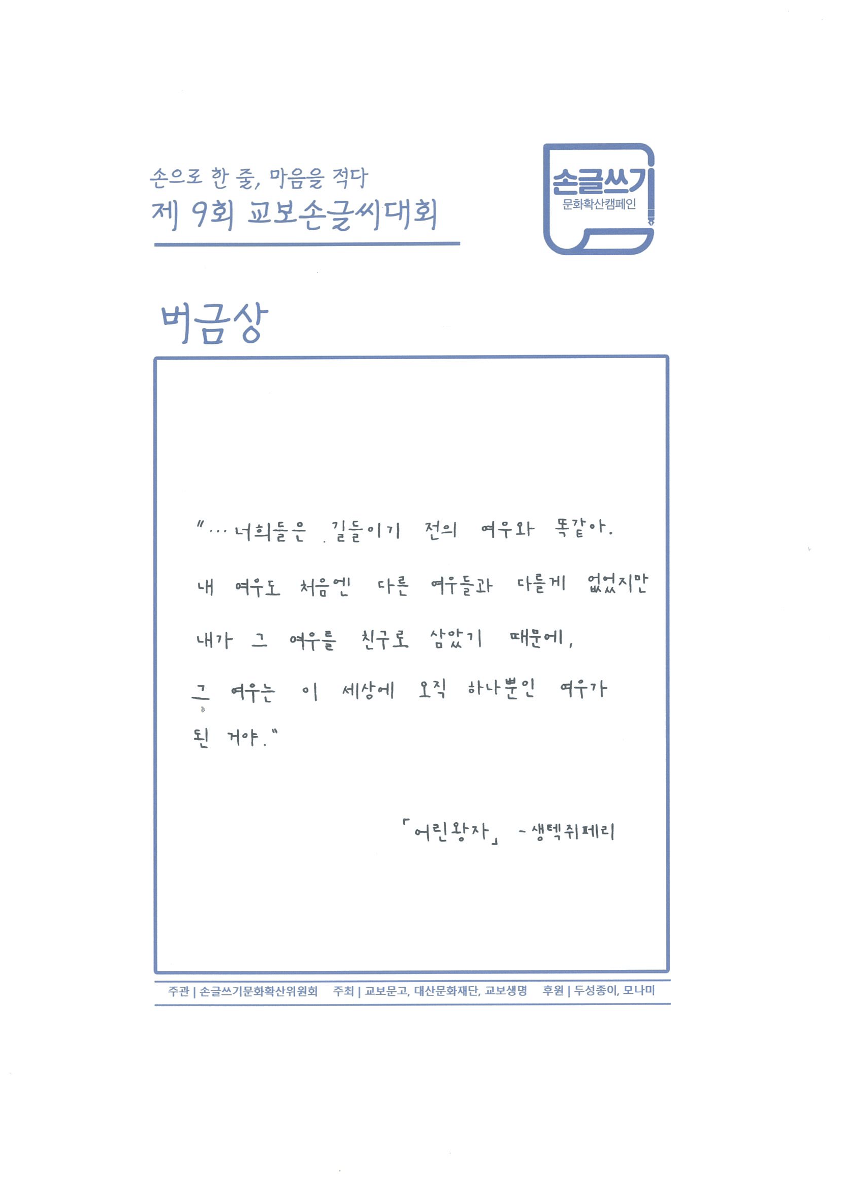 Á¦9ȸ ±³º¸¼Õ±Û¾¾´ëȸ û¼Ò³âºÎ¹® ¹ö±Ý»ó