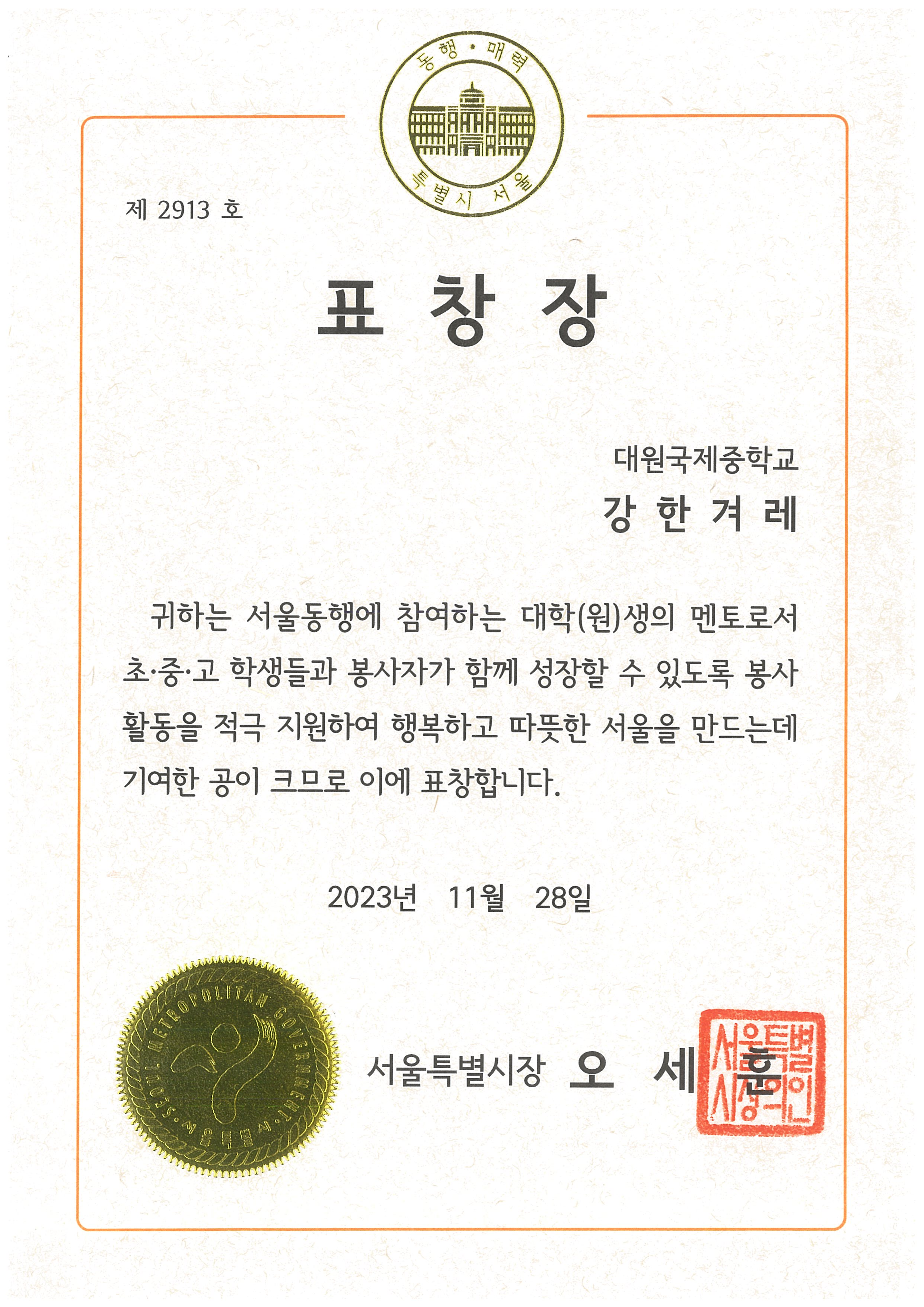 ´ë¿ø±¹Á¦ÁßÇб³ ¹× °­ÇѰܷ¹¼±»ý´ÔÀÌ ¼­¿ïµ¿Çà ǥâÀ» ¼ö»óÇÏ¿´½À´Ï´Ù.