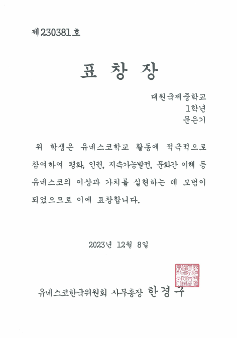 À¯³×½ºÄÚÇб³ Ȱµ¿ ǥâÀå ¼ö»ó