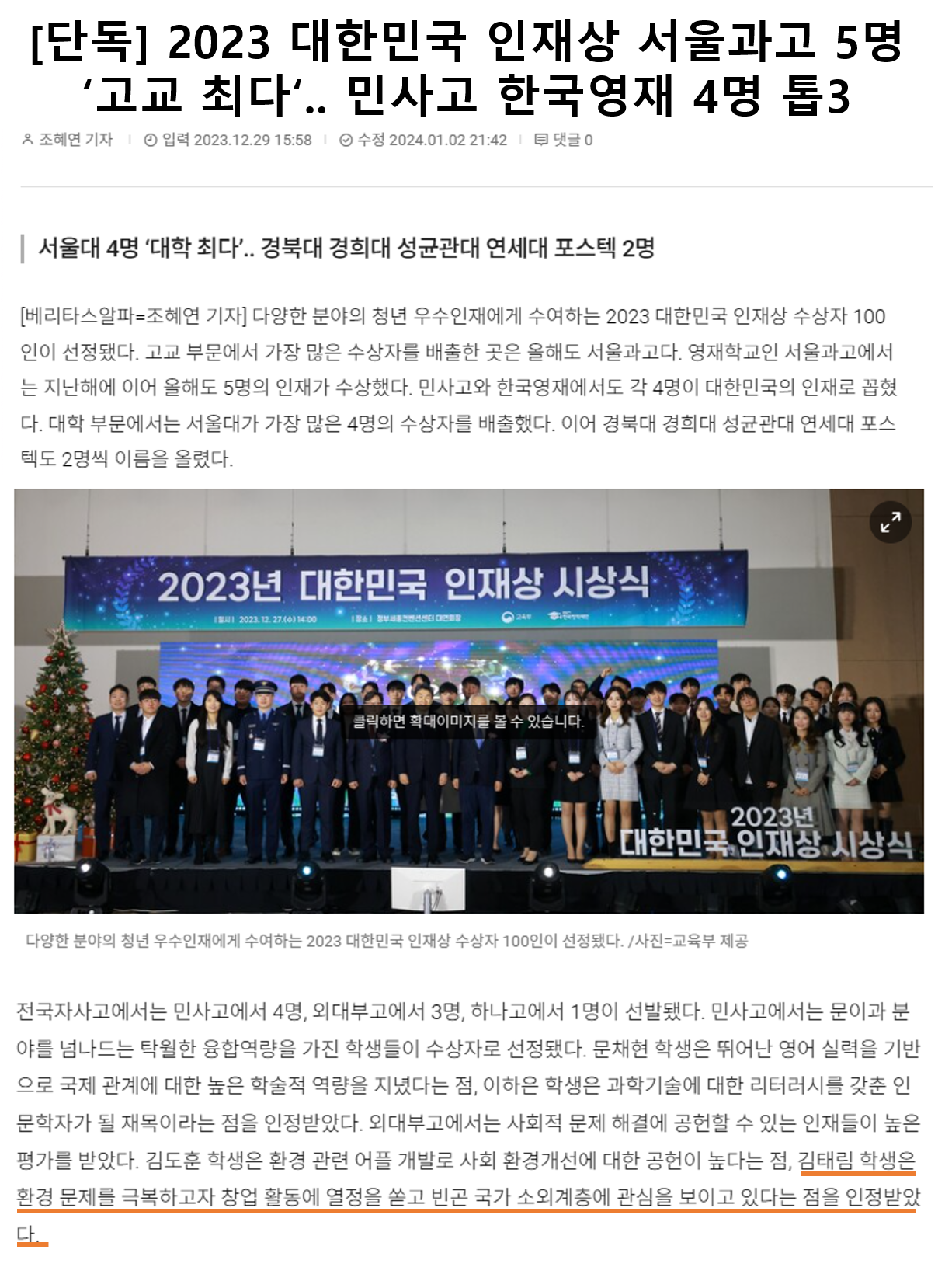[´Üµ¶] 2023 ´ëÇѹα¹ ÀÎÀç»ó ¼¿ï°ú°í 5¸í ‘°í±³ ÃÖ´Ù’.. ¹Î»ç°í Çѱ¹¿µÀç 4¸í Åé3