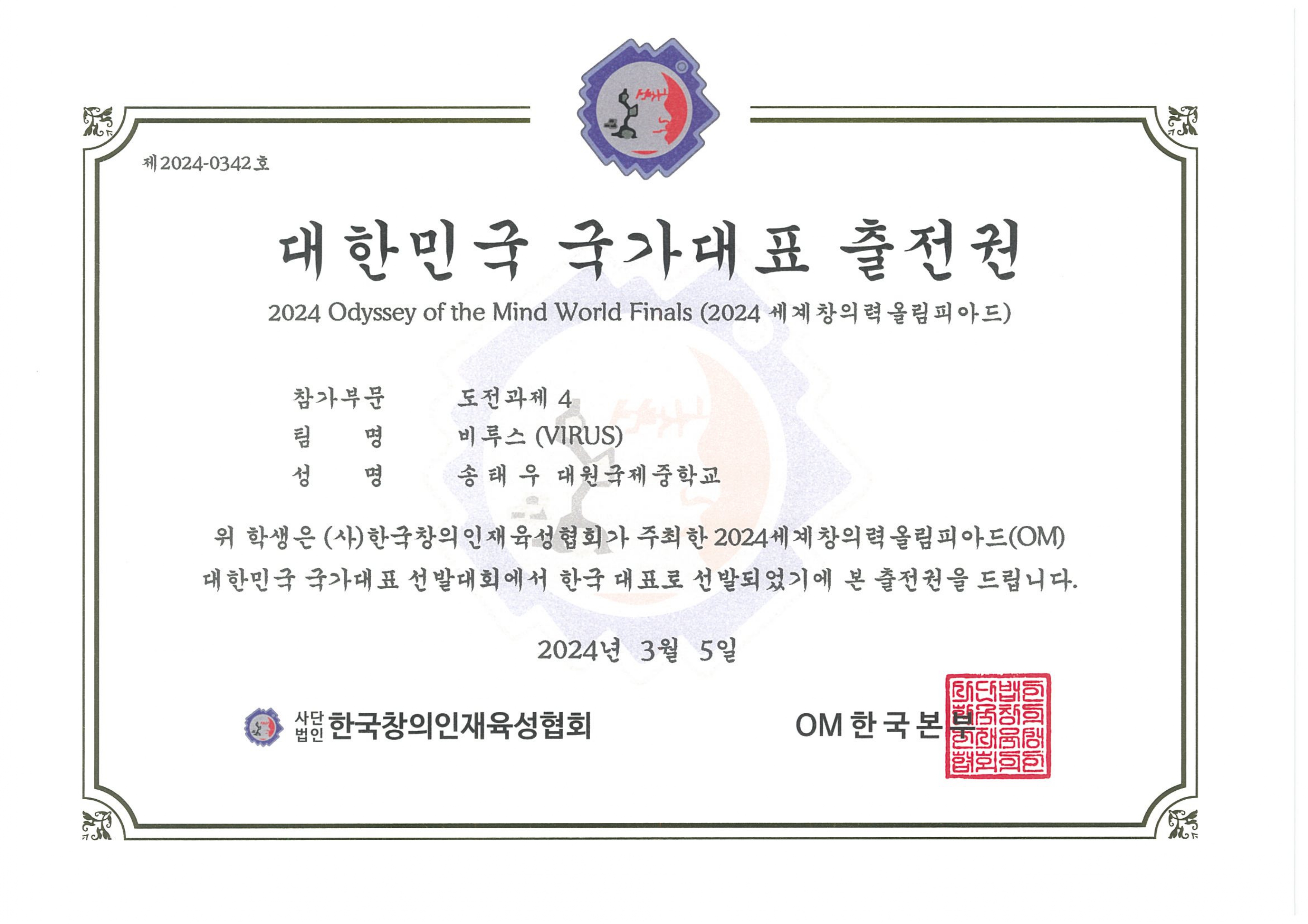 10321 ¼ÛÅ¿ì ÇлýÀÌ 2024³â ¼¼°èâÀÇ·Â ¿Ã¸²ÇÇ¾Æµå ´ëÇѹα¹ ±¹°¡´ëÇ¥ ¼±¹ß´ëȸ¿¡¼­ ¾Æ·¡¿Í °°ÀÌ ÀÔ»óÇÏ¿´½À´Ï´Ù.