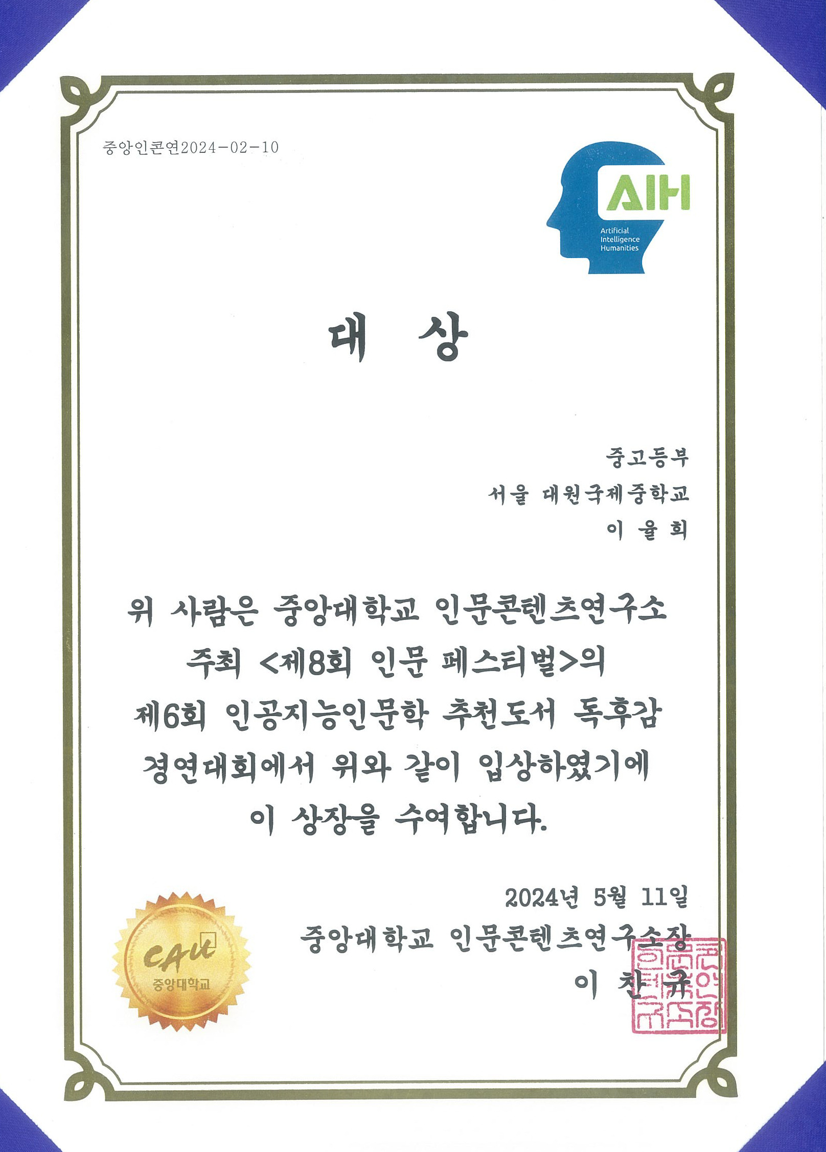 Á¦6ȸ ÀΰøÁö´ÉÀι®ÇÐ Ãßõµµ¼­ µ¶Èݨ °æ¿¬´ëȸ¿¡¼­ ÀÌÀ²Èñ ÇлýÀÌ ´ë»ó ¼ö»óÇÏ¿´½À´Ï´Ù.