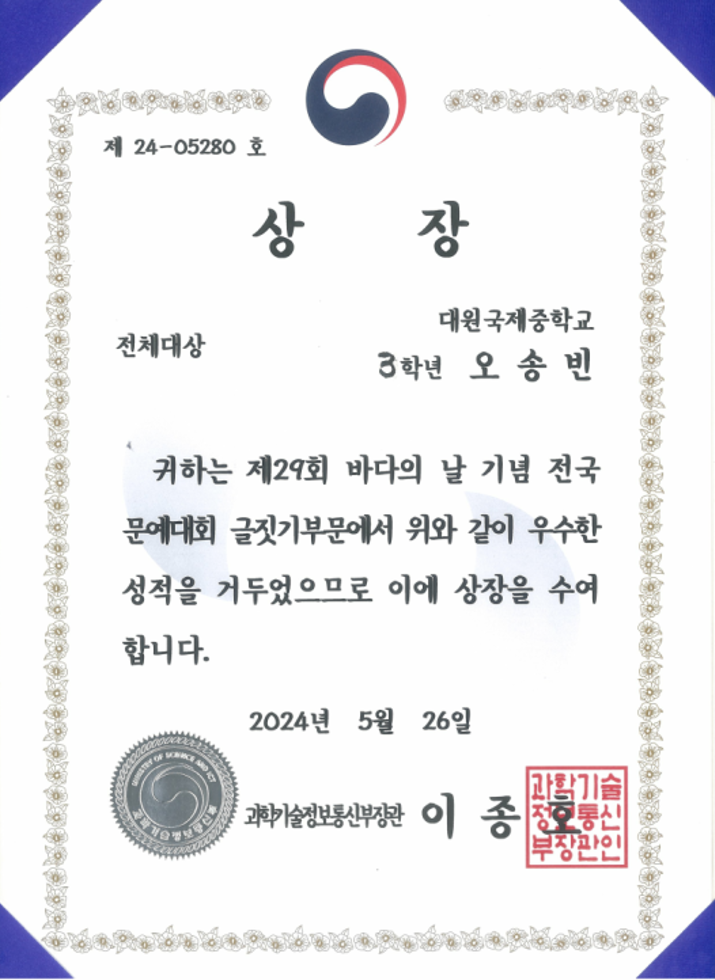 Á¦29ȸ ¹Ù´ÙÀÇ ³¯ ±â³ä Àü±¹¹®¿¹´ëȸ ±ÛÁþ±âºÎ¹®¿¡¼­ ´ë»óÀ» ¼ö»óÇÏ¿´½À´Ï´Ù.