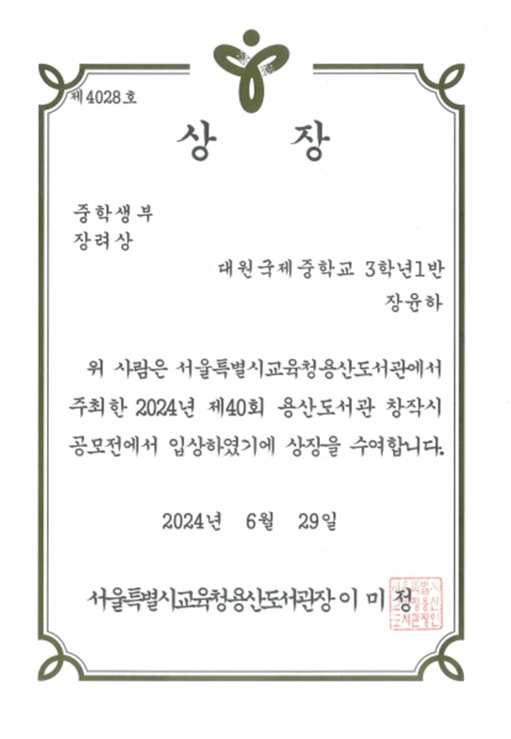 2024³â Á¦40ȸ ¿ë»êµµ¼­°ü âÀ۽à °ø¸ðÀü ÁßÇлýºÎ Àå·Á»óÀ» ¼ö»óÇÏ¿´½À´Ï´Ù.
