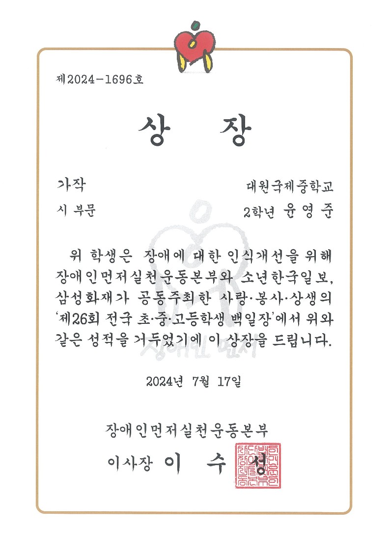 Á¦26ȸ Àü±¹ Àå¾ÖÀνݳ¼± ¹éÀÏÀå ¼ö»ó