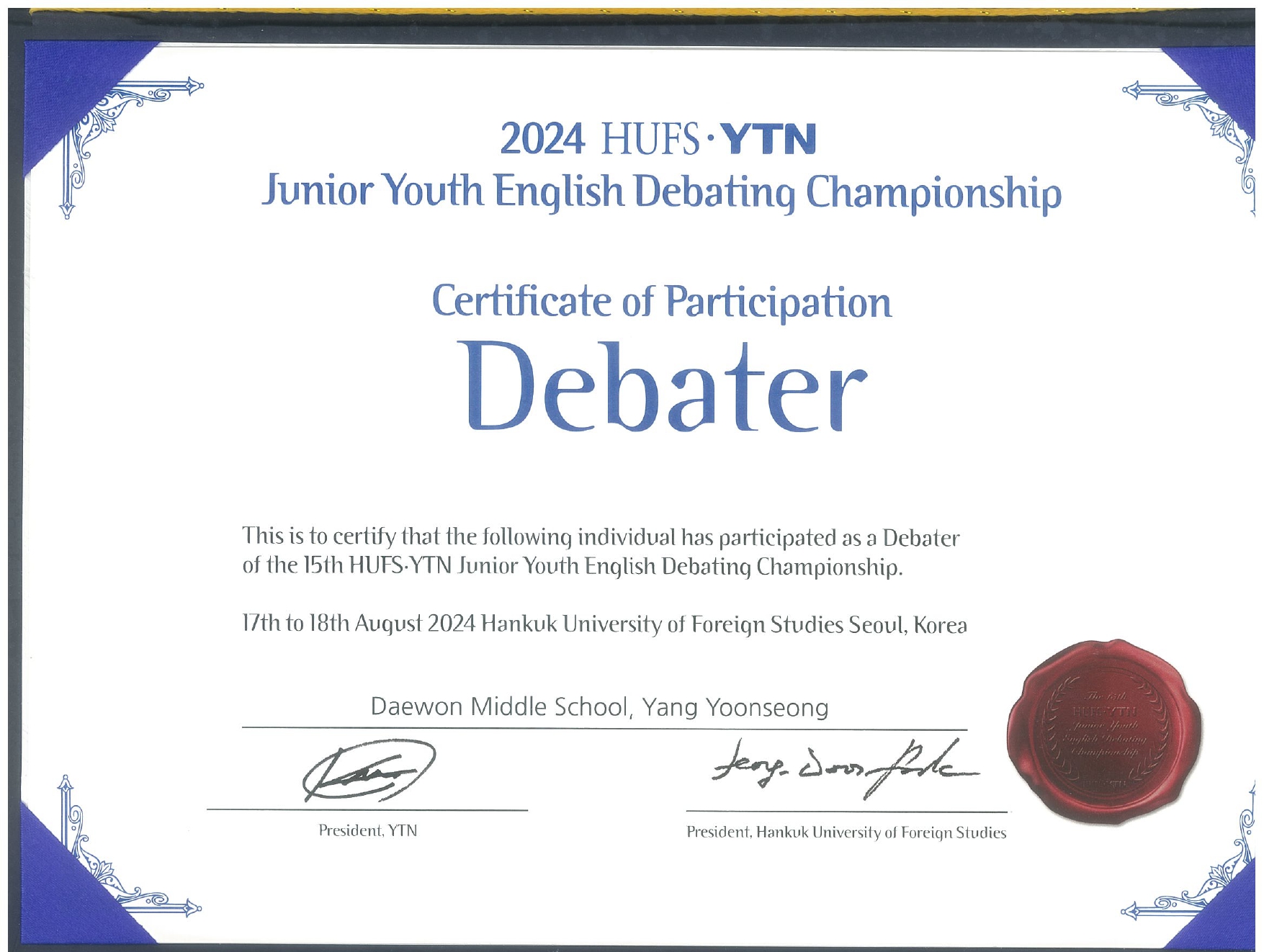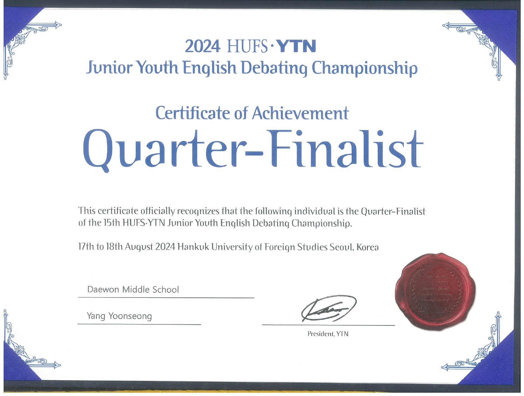 2Çгâ Europe¹Ý ¾çÀ±¼º Çлý 2024 HUFS YTN Junior Youth English Debating Championship Quarter-Finalist
