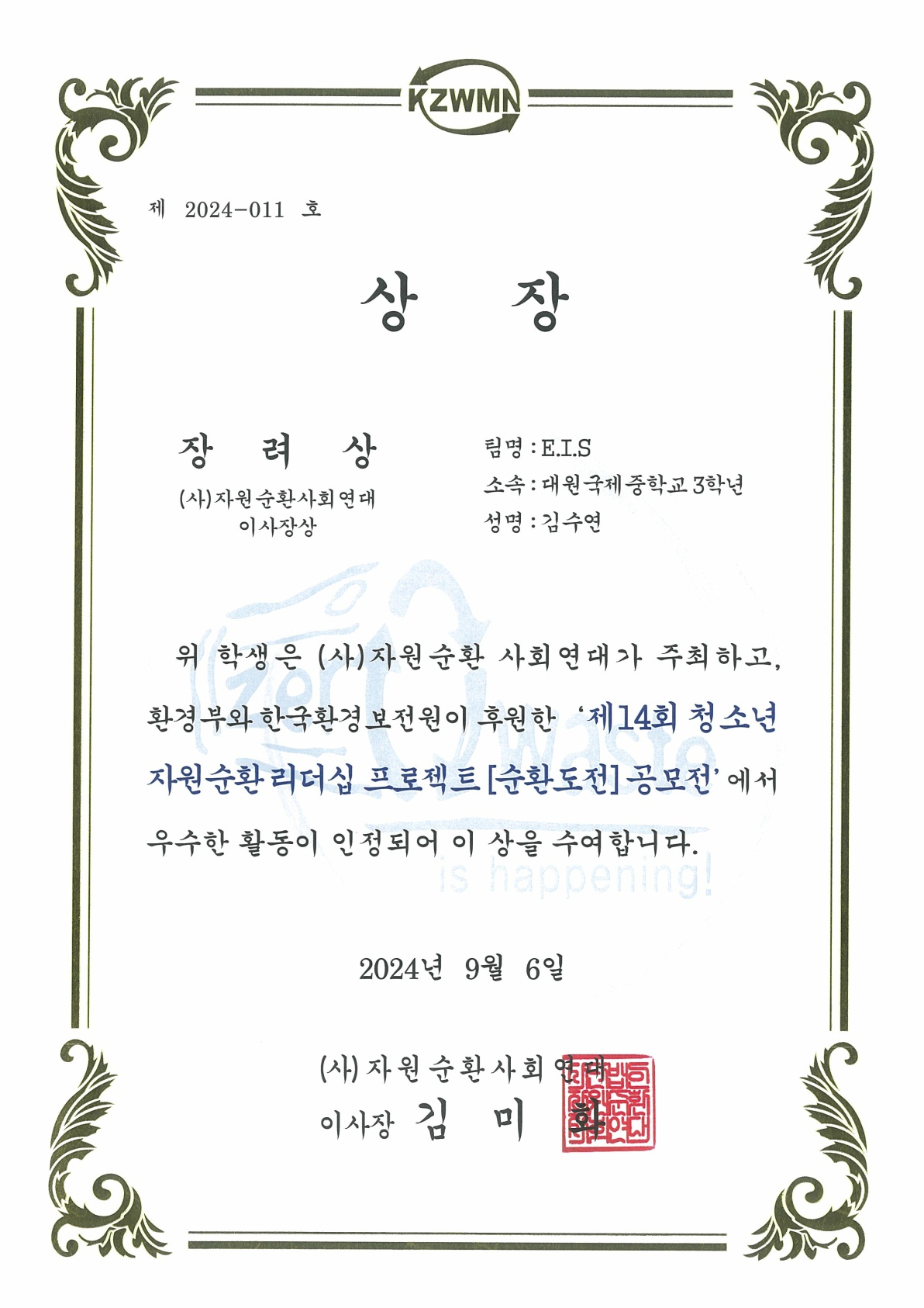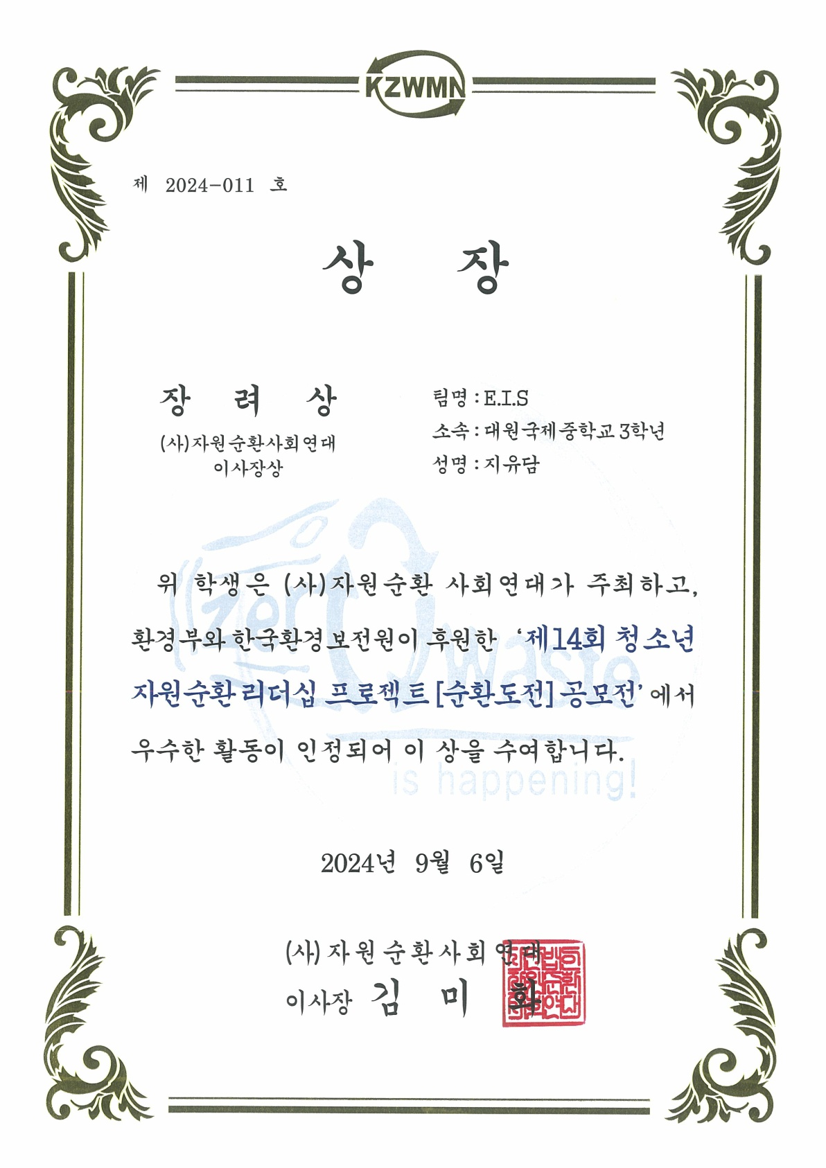 Á¦14ȸ û¼Ò³â ÀÚ¿ø¼øÈ¯ ¸®´õ½Ê ÇÁ·ÎÁ§Æ®[¼øÈ¯µµÀü]°ø¸ðÀü Àå·Á»óÀ» ¼ö»óÇÏ¿´½À´Ï´Ù.