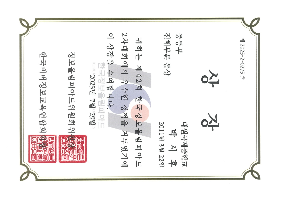 ´ë¿ø±¹Á¦ÁßÇб³ 2Çгâ 1¹Ý ¹Ú½ÃÈÄÇлýÀÌ Á¦42ȸ Çѱ¹Á¤º¸¿Ã¸²ÇǾƵå 2Â÷´ëȸ¿¡¼­ ÁßµîºÎ ÀüüºÎ¹® µ¿»óÀ» ¼ö»óÇÏ¿´½À´Ï´Ù.