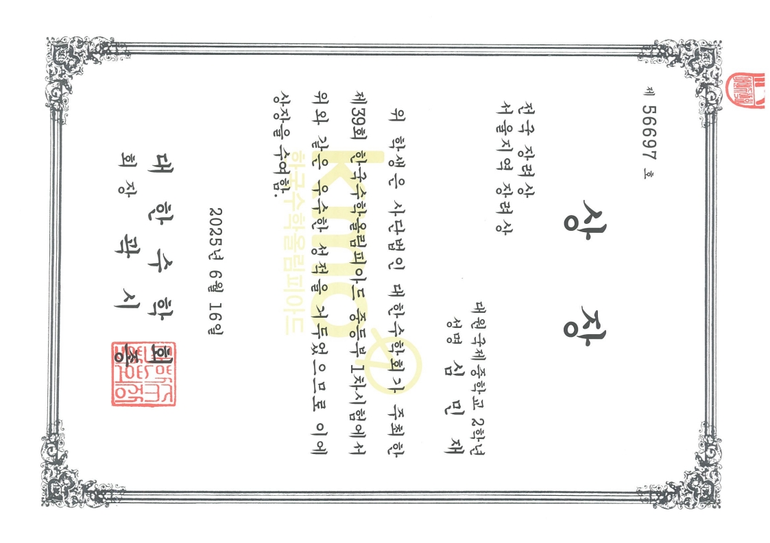 ´ë¿ø±¹Á¦ÁßÇб³ 2Çгâ 1¹Ý ½É¹ÎÀçÇлýÀÌ Á¦39ȸ Çѱ¹¼öÇпø²ÇǾƵå ÁßµîºÎ 1Â÷½ÃÇè¿¡¼­ ¼­¿ïÁö¿ª Àå·Á»óÀ» ¼ö»óÇß½À´Ï´Ù.