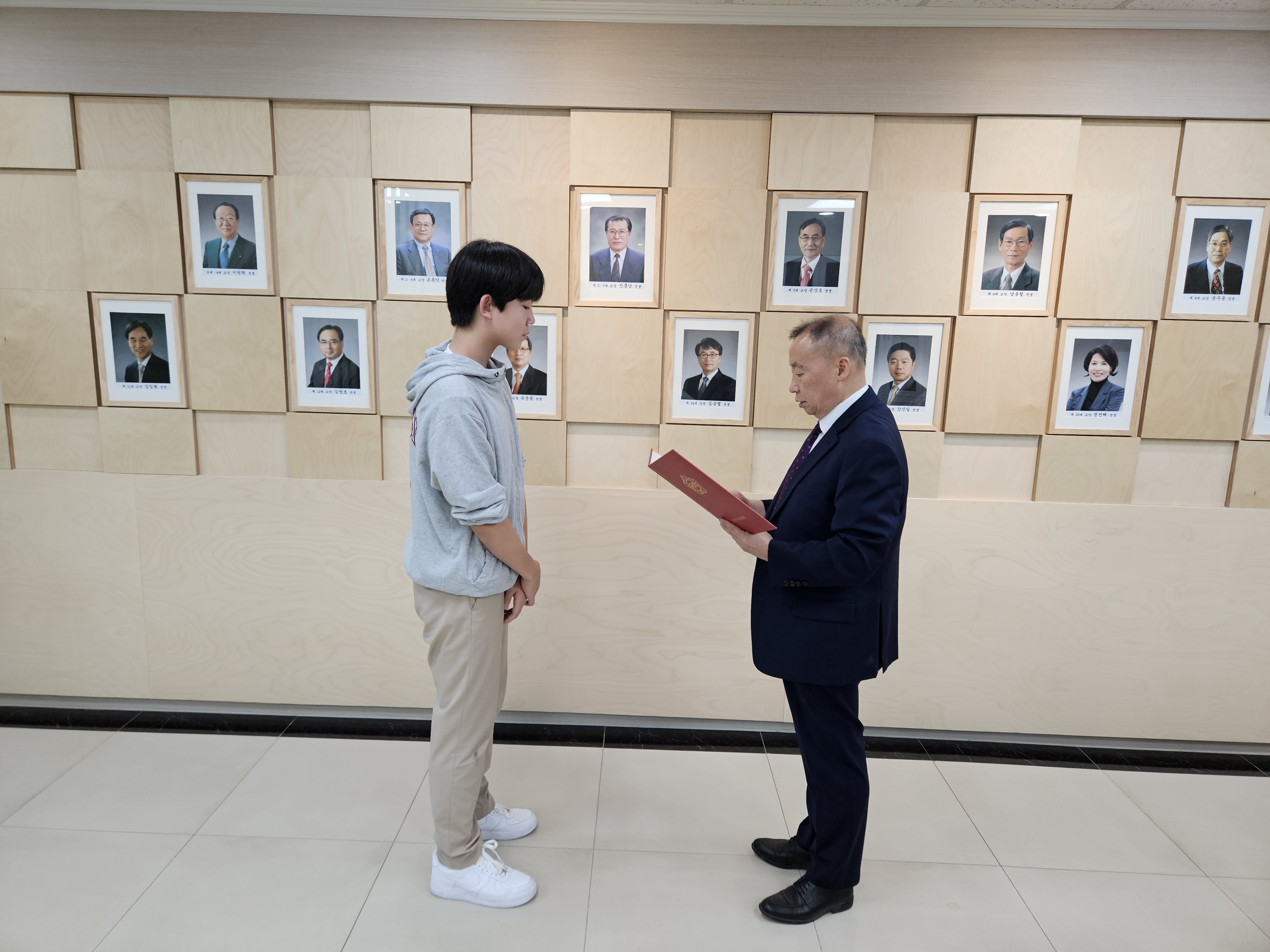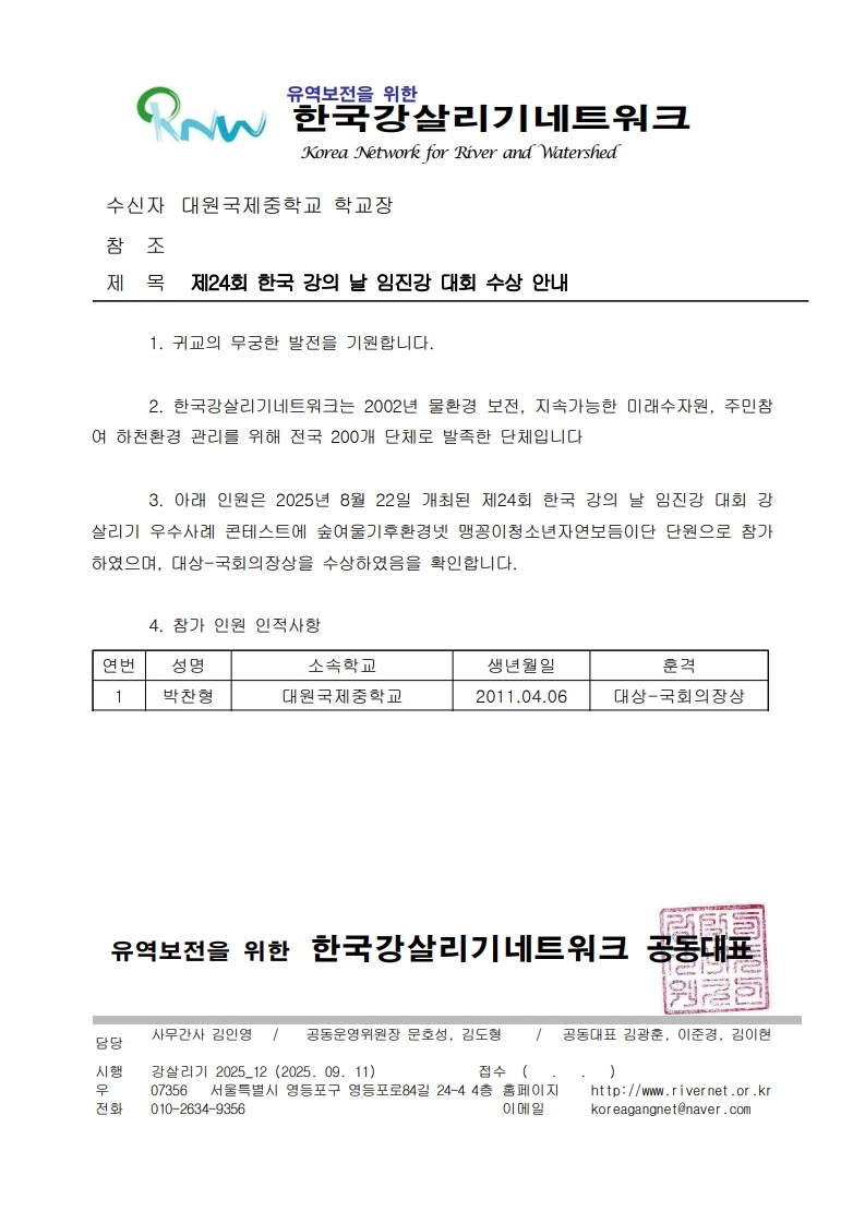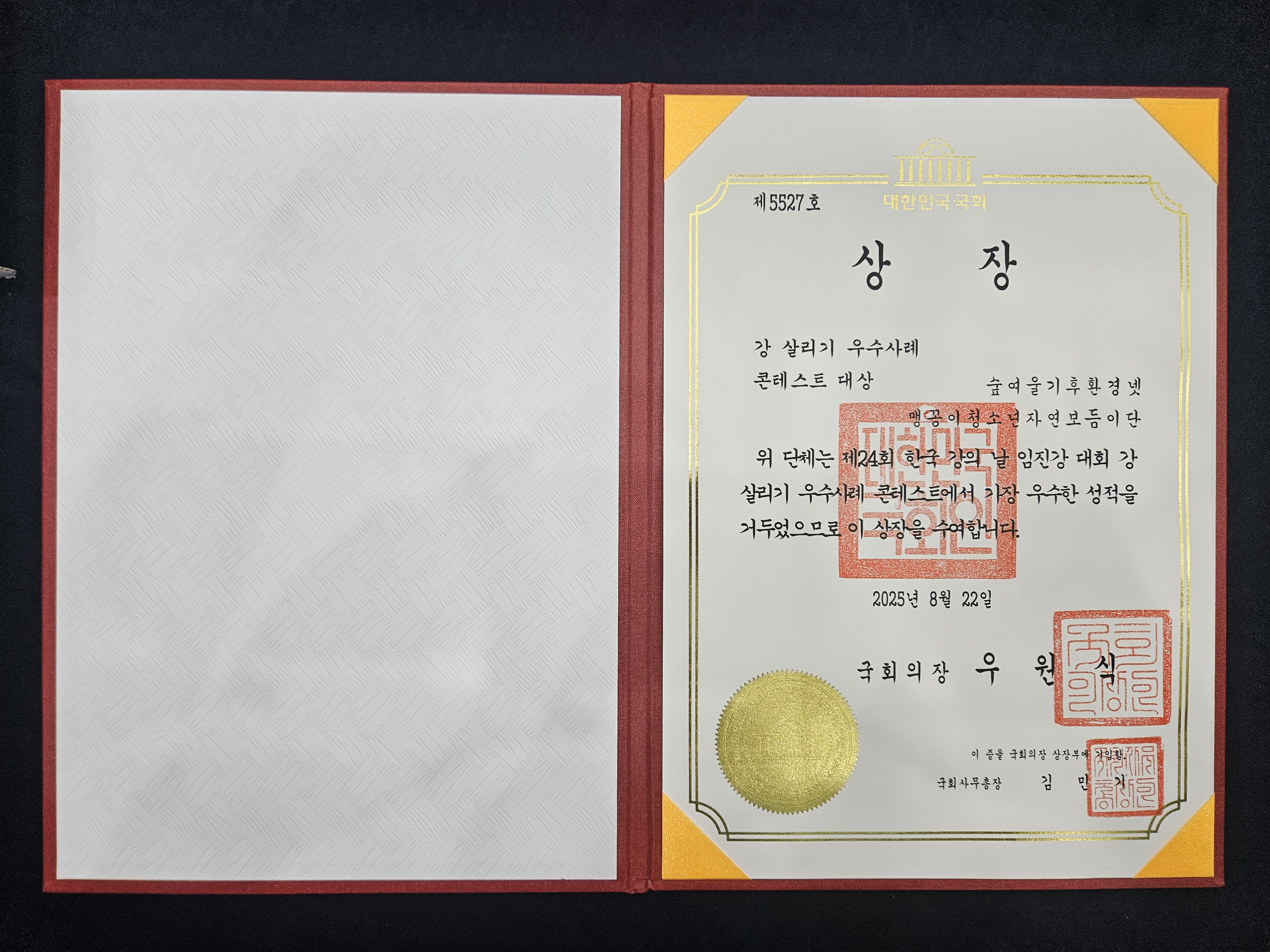 'Á¦ 24ȸ ÀÓÁø°­ ´ëȸ °­»ì¸®±â ¿ì¼ö»ç·Ê ÄÜÅ×½ºÆ®' ¿¡¼­ ´ë¿ø±¹Á¦ÁßÇб³ 2Çгâ 1¹Ý ¹ÚÂùÇüÇлýÀÌ Âü°¡ÇÑ '½£¿©¿ï±âÈÄȯ°æ³Ý ¸Í²ÇÀÌû¼Ò³âÀÚ¿¬º¸µëÀÌ´Ü'ÀÌ ´ë»ó(±¹È¸ÀÇÀå»ó)À» ¼ö»óÇÏ¿´½À´Ï´Ù.