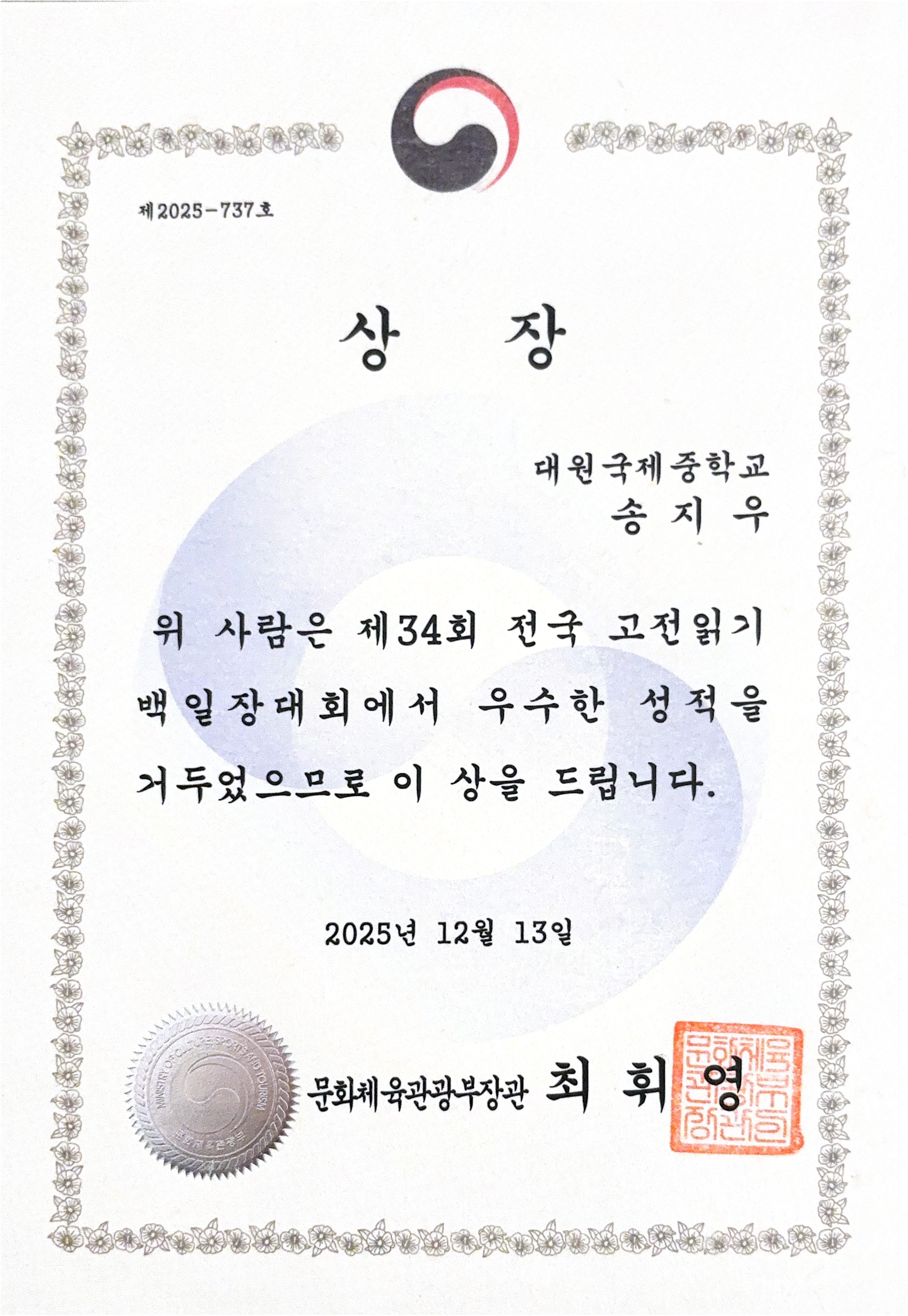 ´ë¿ø±¹Á¦Áß 2Çгâ 2¹Ý ¼ÛÁö¿ìÇлýÀÌ Á¦34ȸ Àü±¹ °íÀüÀб⠹éÀÏÀå´ëȸ¿¡¼­ ¿ì¼öÇÑ ¼ºÀûÀ¸·Î ¾Æ·¡¿Í °°ÀÌ ¼ö»óÇß½À´Ï´Ù.