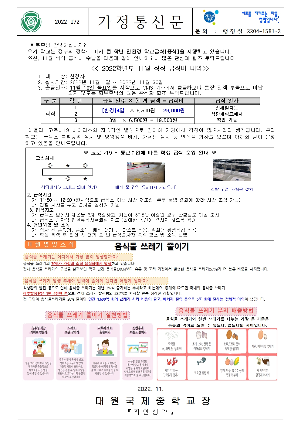 1. 2022³â 11¿ù Çб³ ±Þ½Ä(Áß½Ä) ½Ä´Ü°èȹǥ ÀϺΠº¯°æ.
