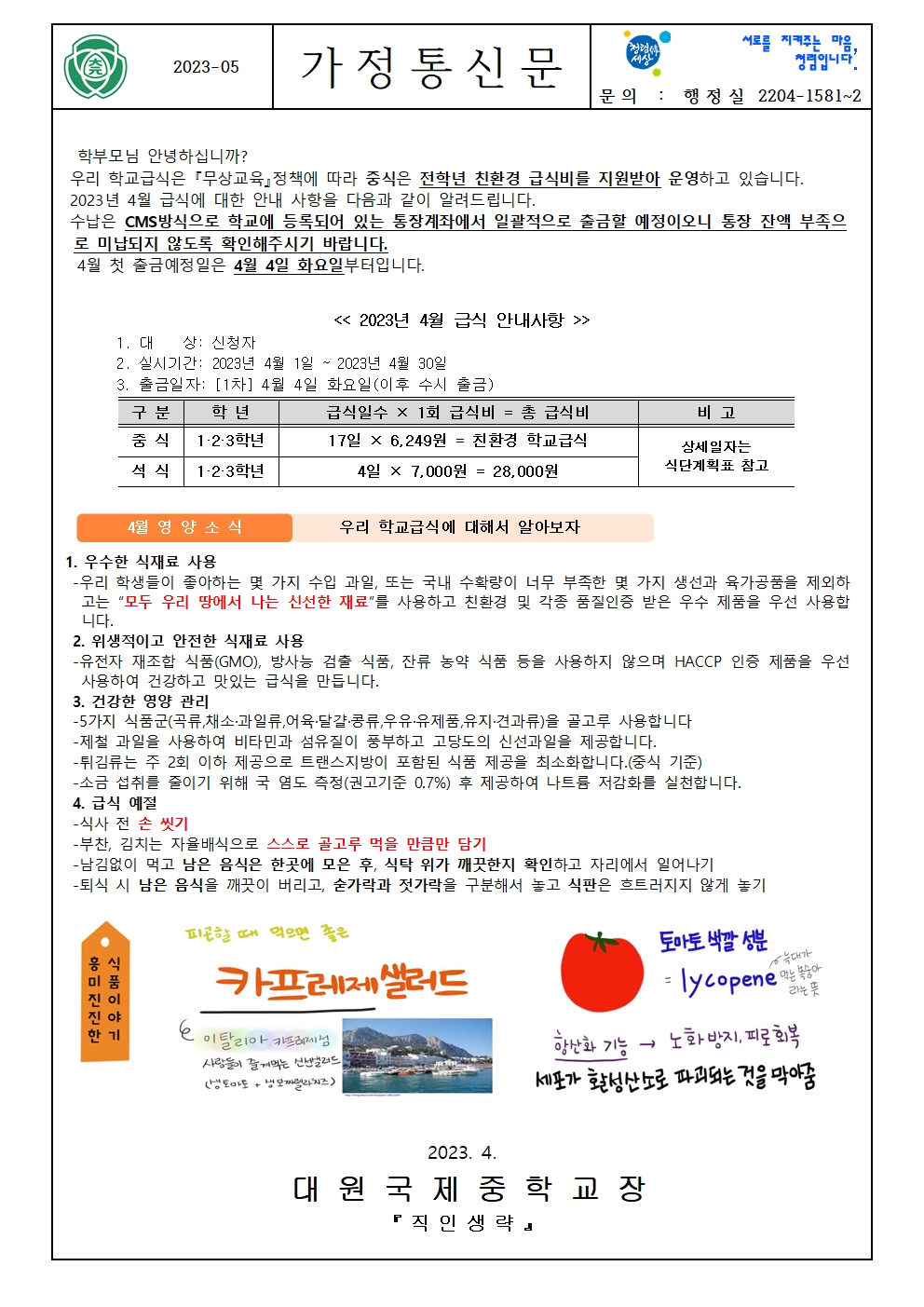 2023Çг⵵ 4¿ù Çб³ ±Þ½Ä(Áß½Ä,¼®½Ä) °¡Á¤Åë½Å¹® ¾È³» (¼®½Äºñ ÀÎÃâ¾È³»,¿µ¾ç±³À°,½Ä´Ü°èȹǥ)