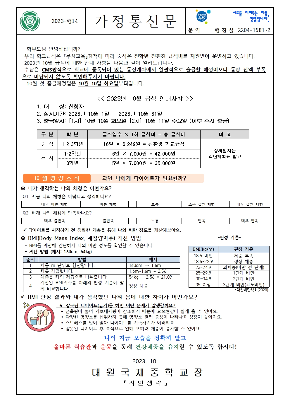2023Çг⵵ 10¿ù Çб³±Þ½Ä(Áß½Ä,¼®½Ä) °¡Á¤Åë½Å¹® ¾È³»(¼®½Äºñ ÀÎÃâ,¿µ¾ç±³À°,½Ä´Ü°èȹǥ)