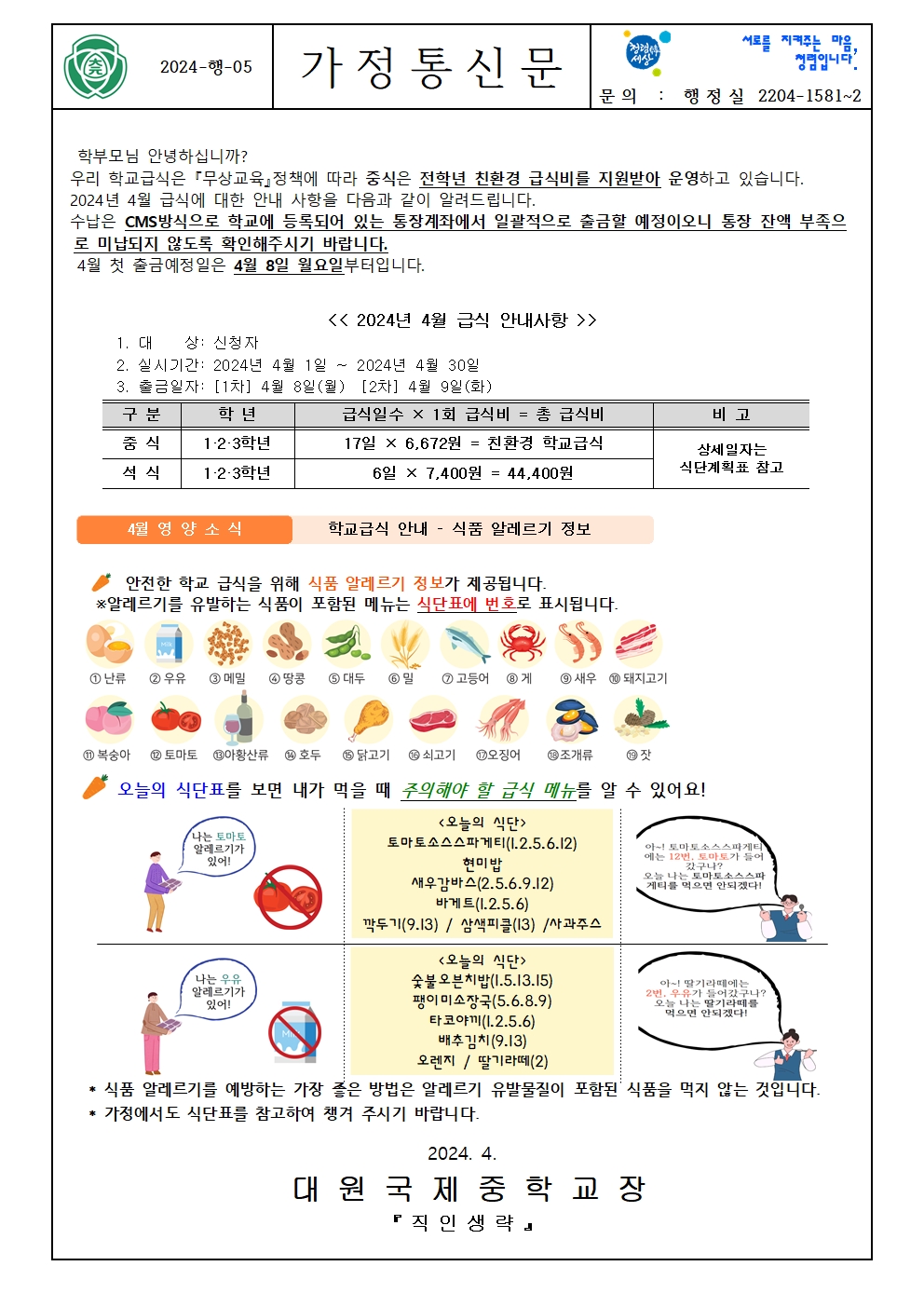 2024Çг⵵ 4¿ù Çб³ ±Þ½Ä(Áß½Ä,¼®½Ä) °¡Á¤Åë½Å¹® ¾È³»(¼®½Äºñ ÀÎÃâ,¿µ¾ç±³À°,½Ä´Ü°èȹǥ)