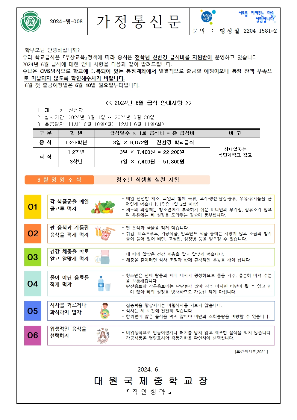 2024Çг⵵ 6¿ù Çб³ ±Þ½Ä(Áß½Ä,¼®½Ä) °¡Á¤Åë½Å¹® ¾È³»(¼®½Äºñ ÀÎÃâ,¿µ¾ç±³À°,½Ä´Ü°èȹǥ)