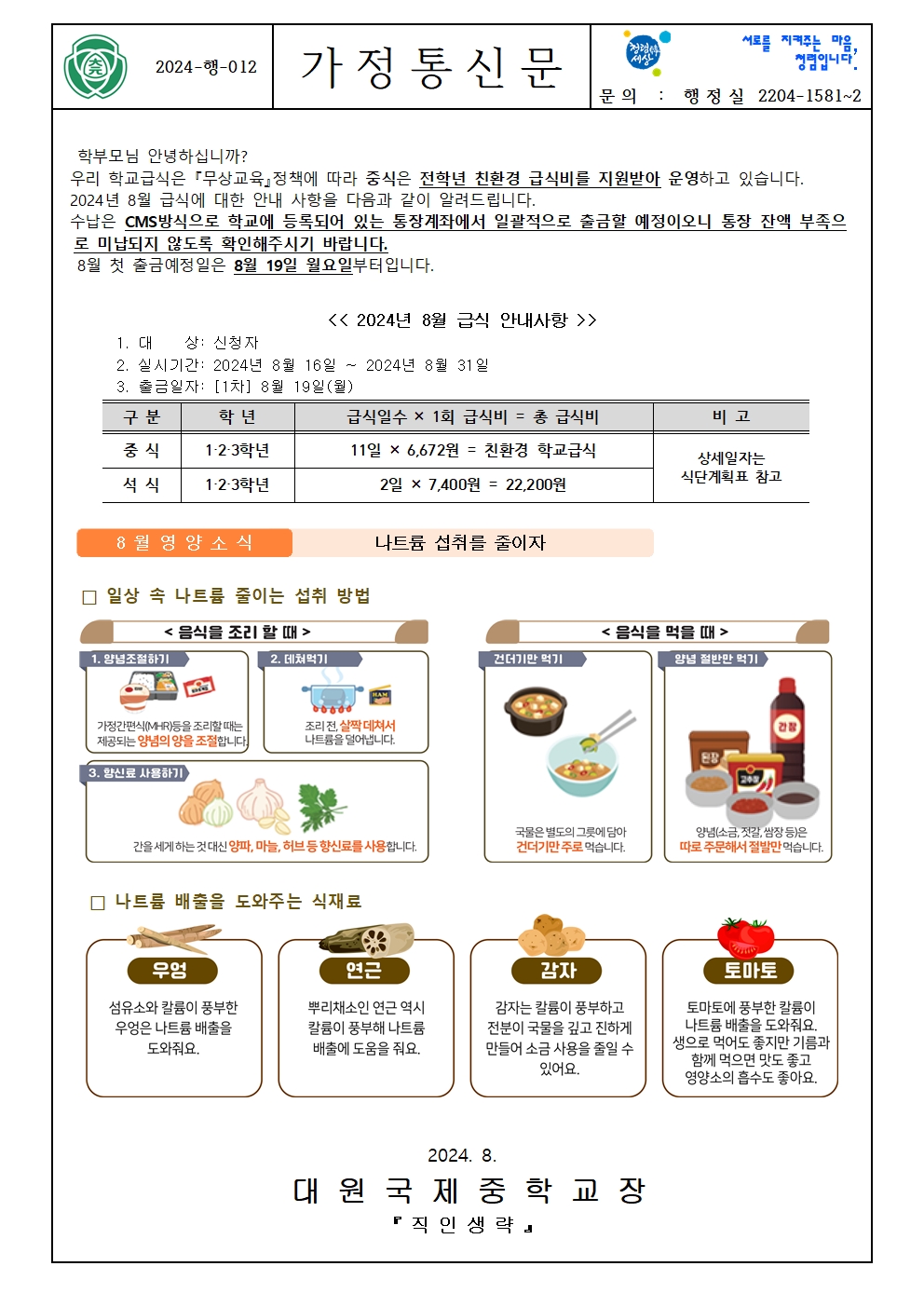 2024Çг⵵ 8¿ù Çб³ ±Þ½Ä(Áß½Ä,¼®½Ä) °¡Á¤Åë½Å¹® ¾È³»(¼®½Äºñ ÀÎÃâ,¿µ¾ç±³À°,½Ä´Ü°èȹǥ)