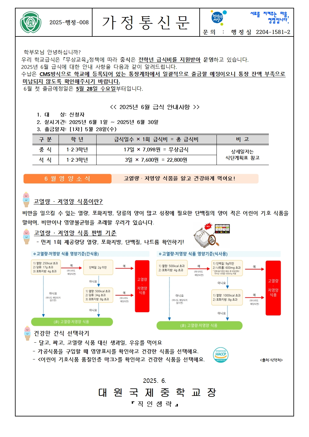 2025Çг⵵ 6¿ù Çб³ ±Þ½Ä(Áß,¼®) °¡Á¤Åë½Å¹® ¾È³»(¼®½Äºñ ÀÎÃ⠾ȳ», ¿µ¾ç¼Ò½Ä, ½Ä´Ü°èȹǥ)