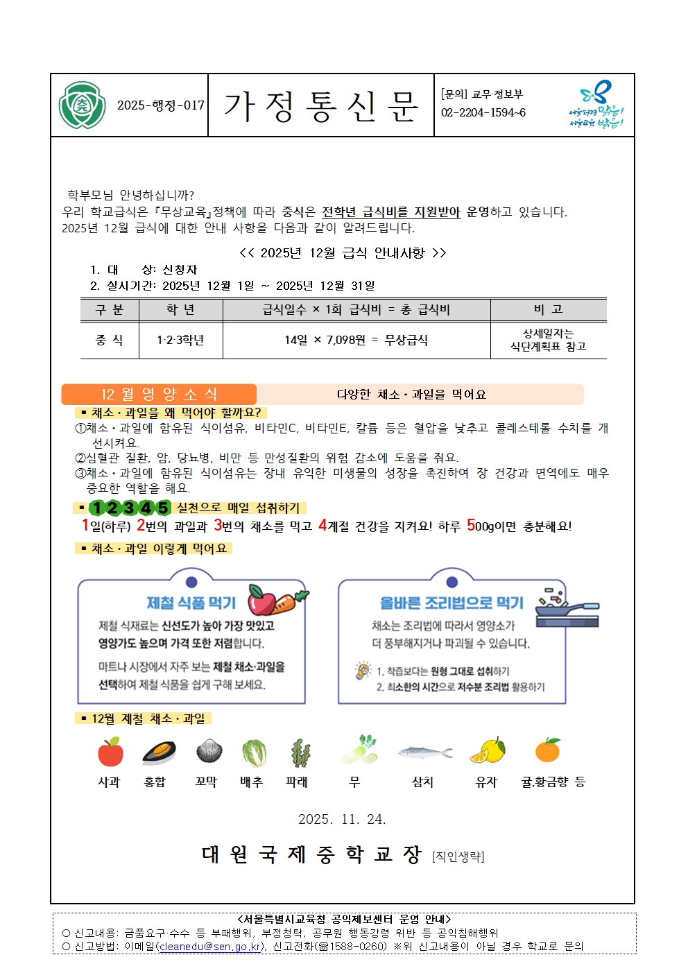 2025Çг⵵ 12¿ù Çб³ ±Þ½Ä(Áß½Ä) °¡Á¤Åë½Å¹® ¾È³»[±Þ½Ä ¾È³», ¿µ¾ç¼Ò½Ä, *½Ä´Ü°èȹǥ(º¯°æ)]