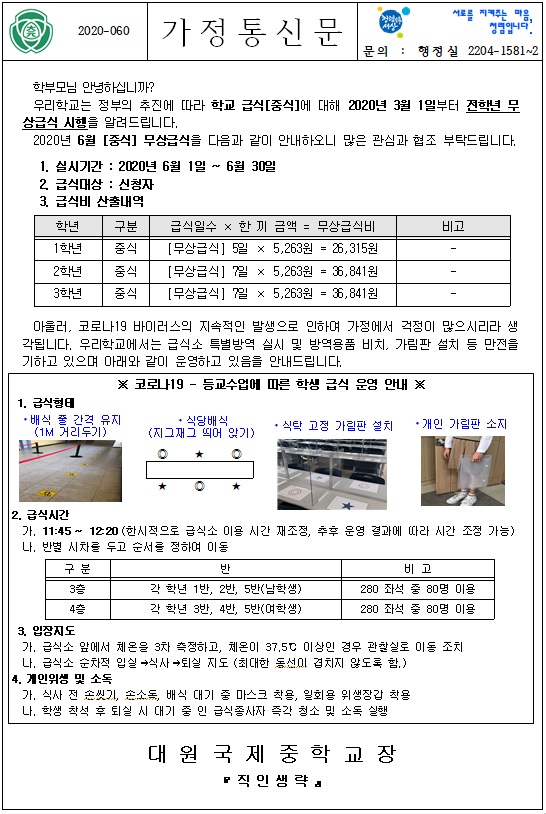 2020Çг⵵ 6¿ù ±Þ½Ä °¡Á¤Åë½Å¹® (±Þ½Äºñ ÀÎÃâ ¹× Äڷγª19 ¿î¿µ ¾È³», ½Ä´Ü°èȹǥ)¸¦ ÷ºÎÇÏ¿À´Ï È®ÀÎ ºÎʵ右´Ï´Ù.
