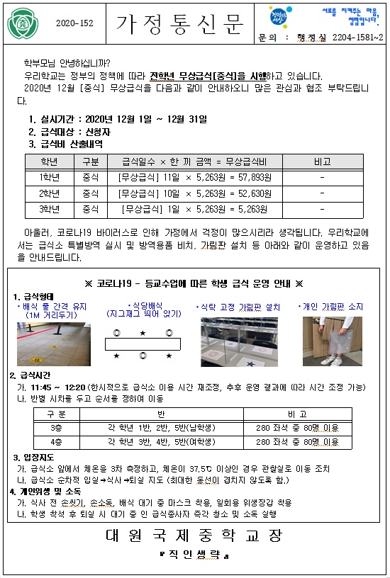 2020Çг⵵ 12¿ù ±Þ½Ä °¡Á¤Åë½Å¹®(±Þ½Äºñ ÀÎÃâ ¹× Äڷγª19 °ü·Ã ¿î¿µ ¾È³», ½Ä´Ü°èȹǥ)¸¦ ÷ºÎÇÏ¿À´Ï È®ÀÎ ºÎʵ右´Ï´Ù.